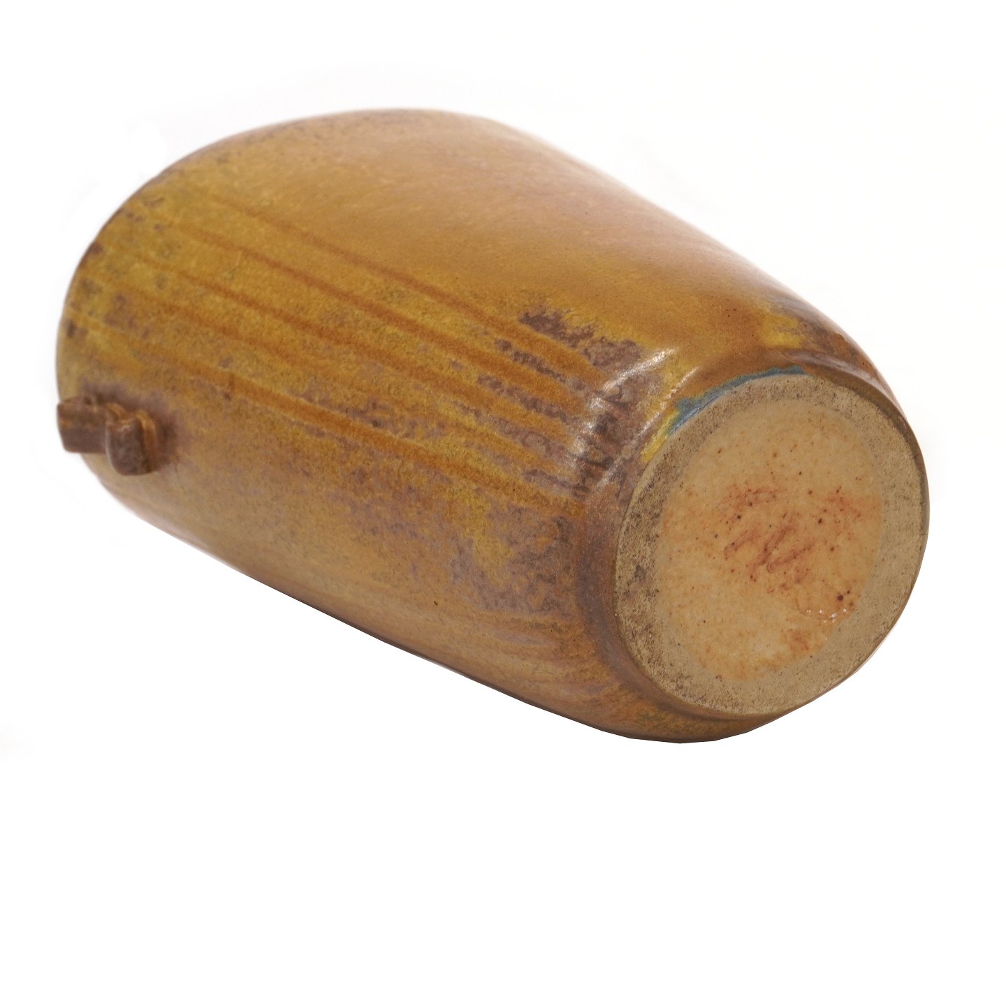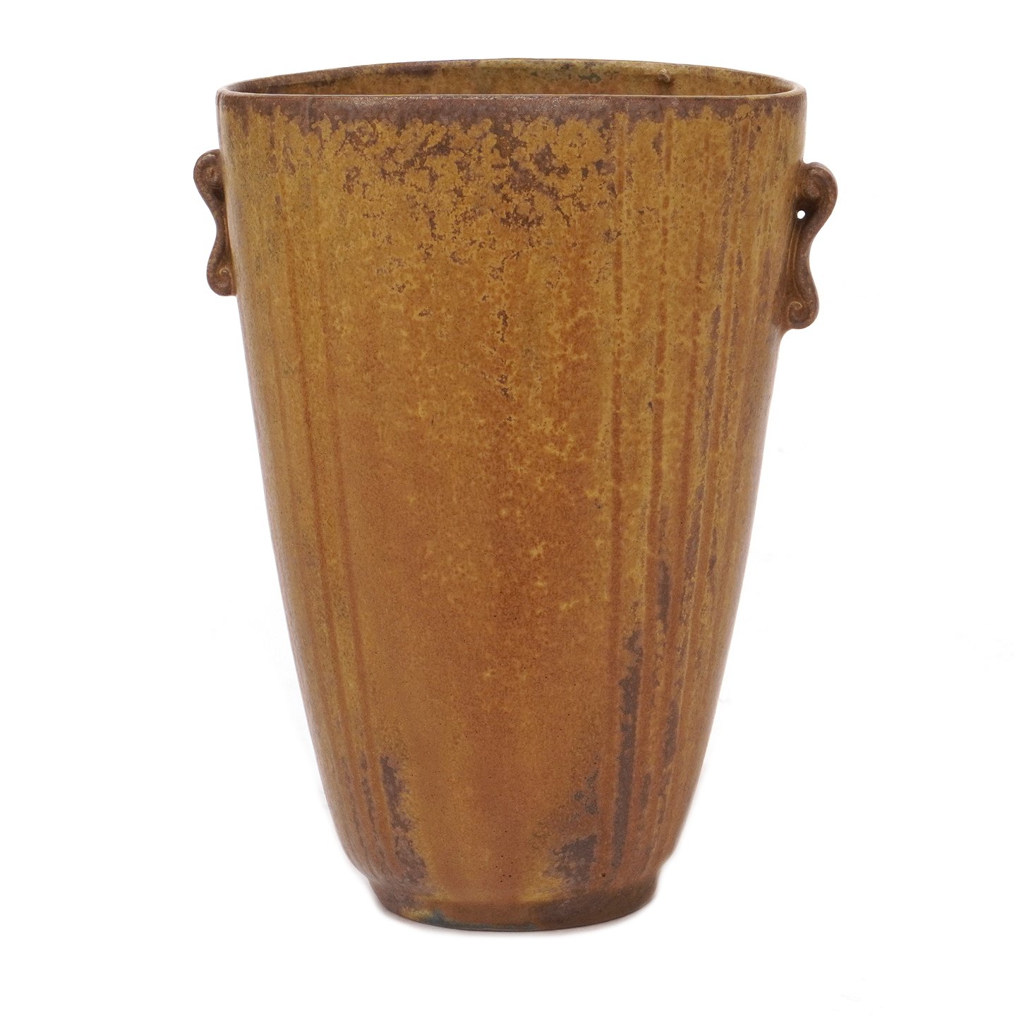 Arne Bang stentøjsvase i stentøj med spættet okkerfarvet glasur signeret AB 70