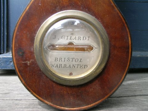 Barometer af mahogni med kantning af citrontræs intarsia. Desuden med hydrometer, termometer, vaterpas og butlersmirrow. Justeringsknap af horn. England 1835-45.