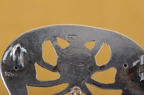 Brooch Art Nouveau, Jugendstil, Art Nouveau organic pattern in silver with closed back. Decorated with cabochon green agate in the center of the brooch and the 3 pendants. Stamped 826S "TM". Art No. 35