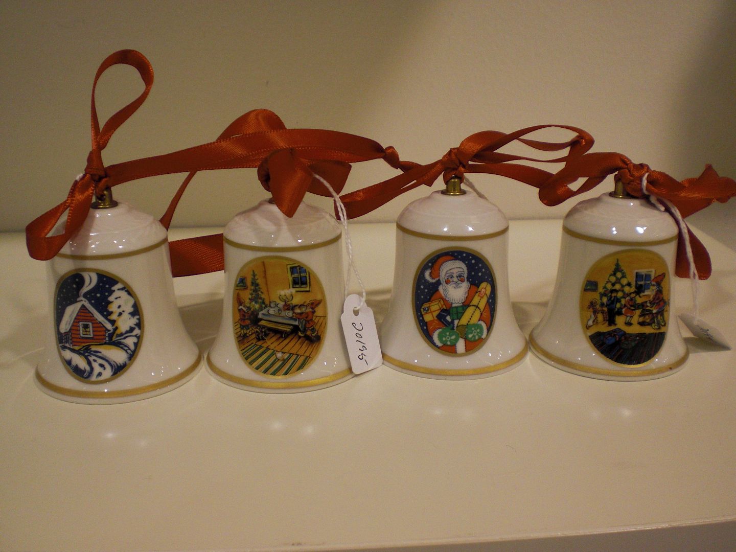 4 Rørstrand porcelænsjuleklokker - ca. 1980. Højde 6 cm. Motiv nr. 5,6,17 og 18.