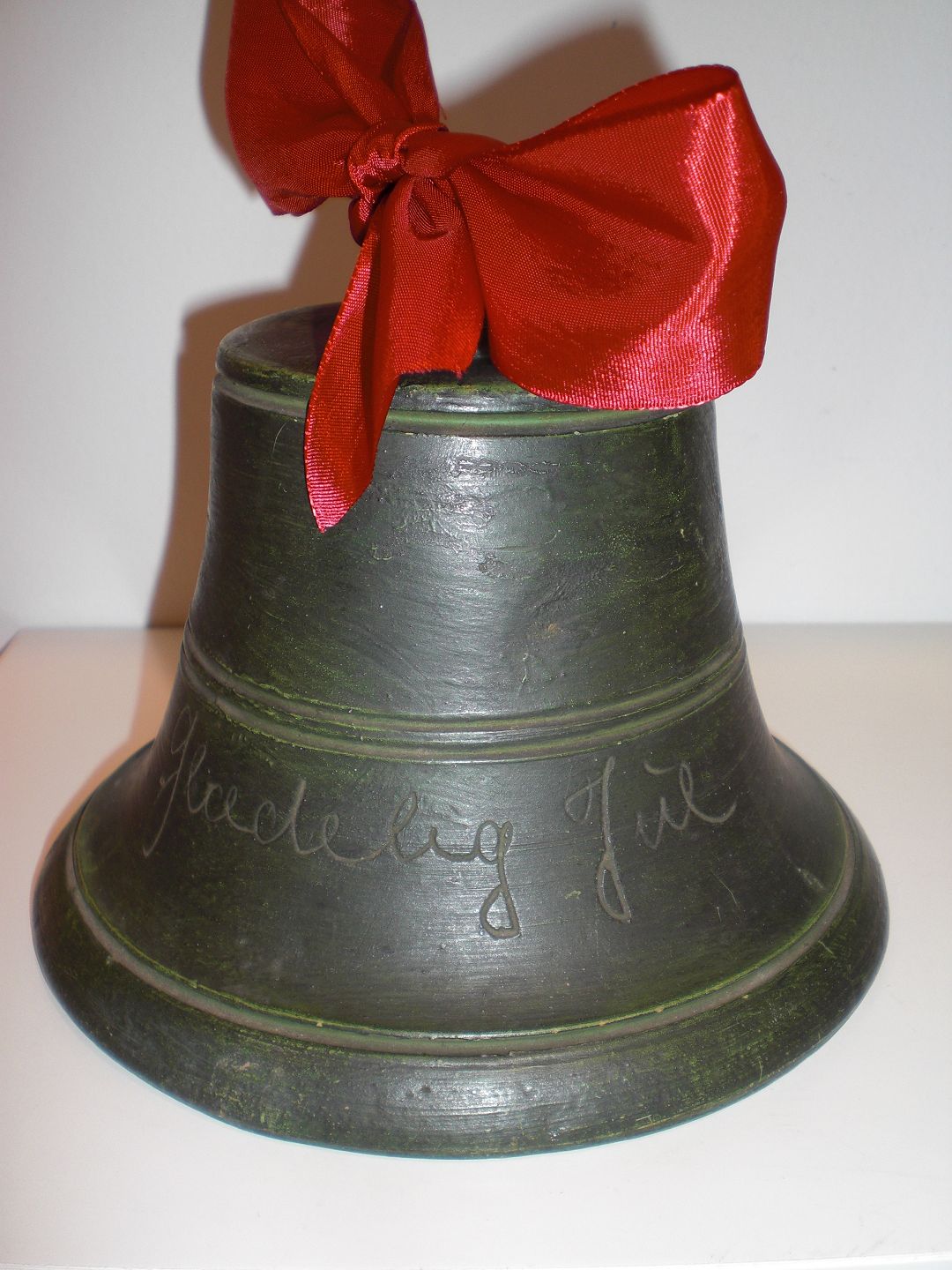 Grøn koldmalet terrakottaklokke af dansk herkomst. Indridset "Glædelig jul" Formentlig fra 1950-erne. Højde: 14 cm. Diameter forneden: 17,5 cm.