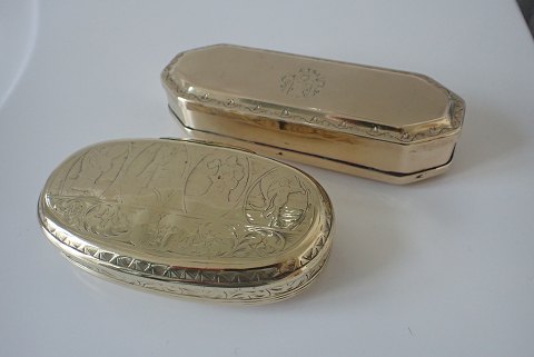 Et par tidlige 1800-tals messingstager formentlig franske ikke helt identiske - der mangler skrue i den ene og denne har let bølget fod uden krage. Den anden har glat fod og krave med en revne. Sælges alligevel som par. Højde: 20 cm.