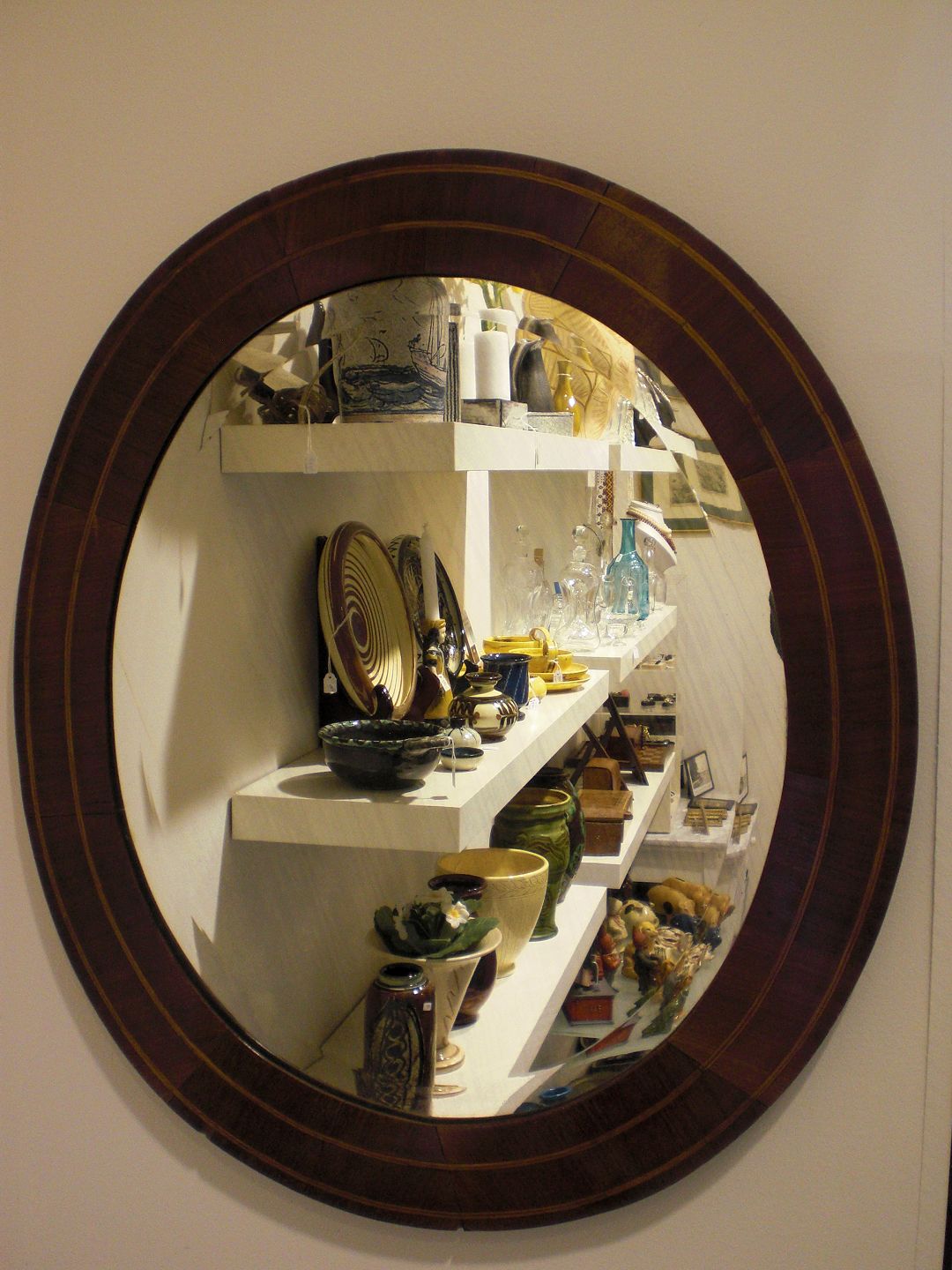 Ovalt dansk empirespegl i mahogni med indtarsia i lyst træ. Ca. 1820. Originalt facetslebent spejlglas med alderspæg. Højde: 64 cm - bredde: 56 cm.