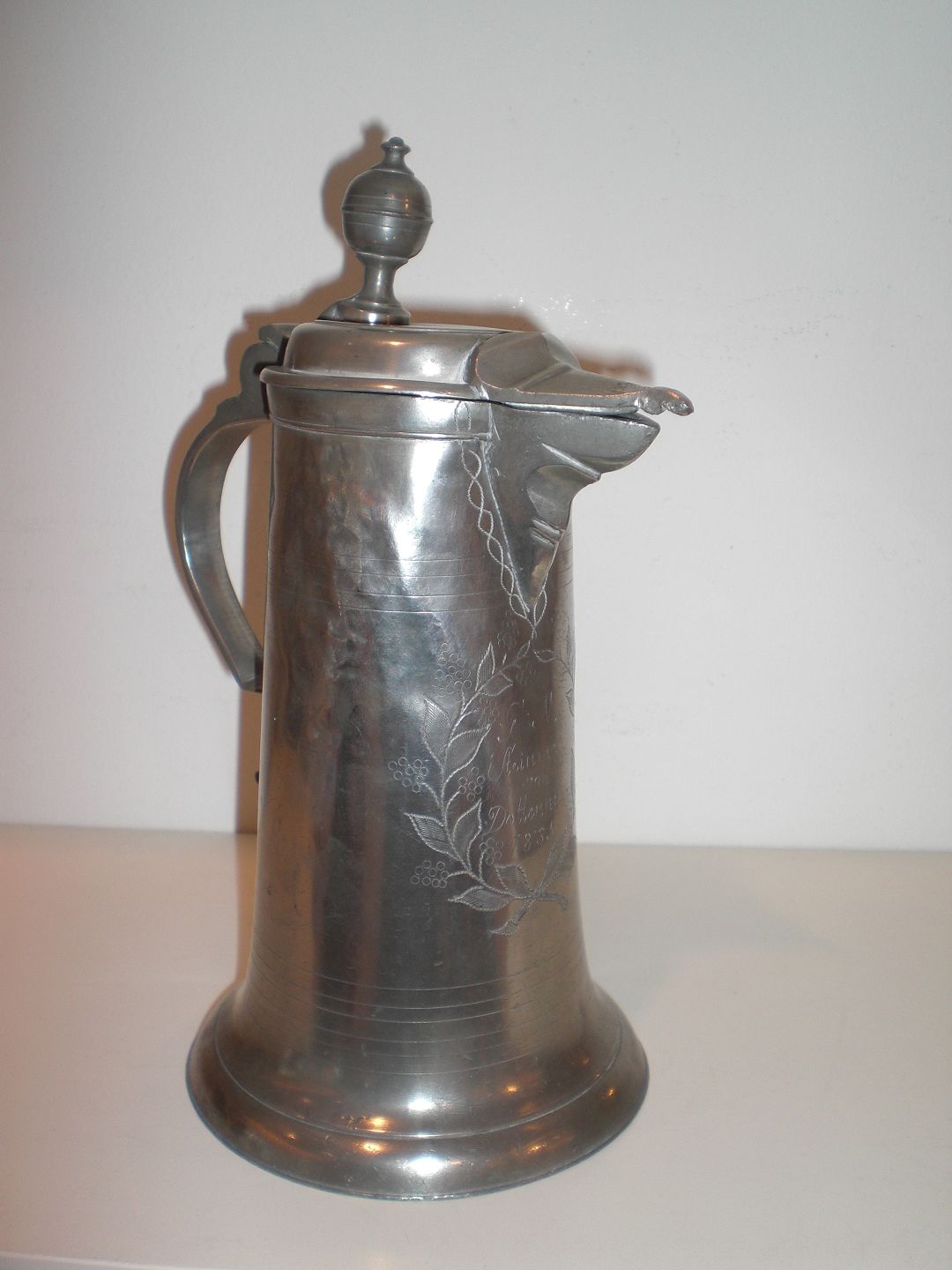 Tysk vinkande med låg i tin med følgende indskription: "G.M.Steinmetz von Dottenheim 1835". Højde: 26 cm. - diameter bund: 13,2 cm.