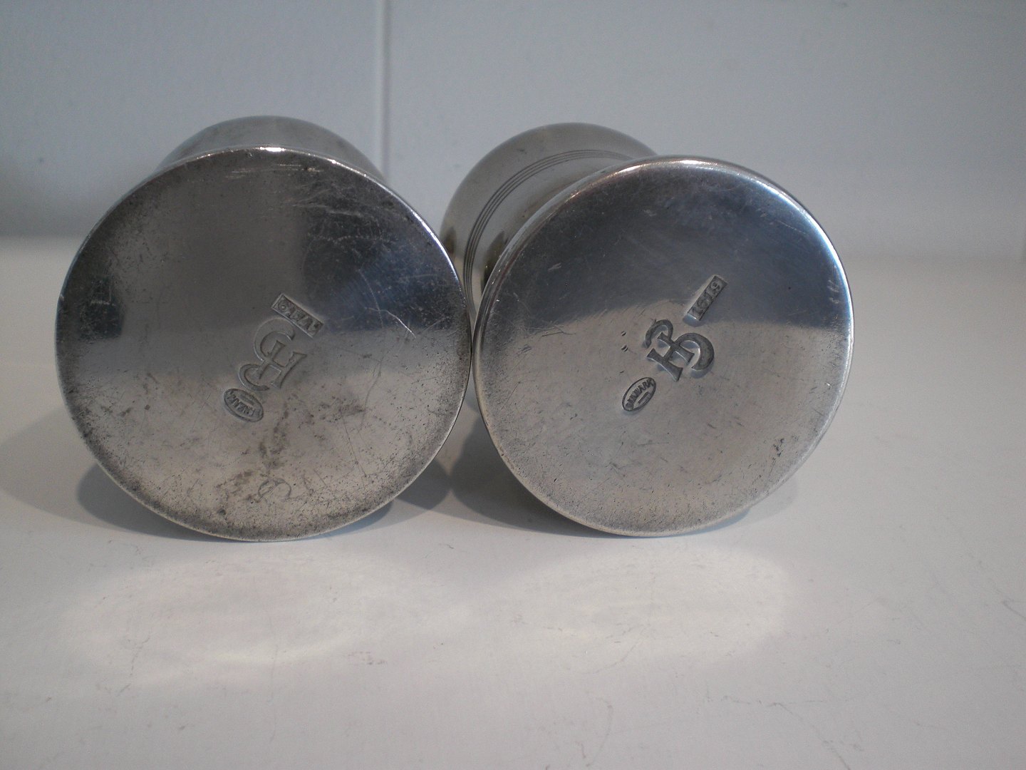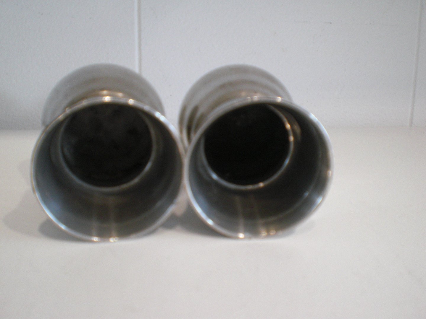 2 bægre/æggebægre i tin stemplet HB = Balling Eftf. 1916 og 1917. Højde: 6,5 cm - diameter foroven: 5 Vejenbogen om Ballins Værksted side 178 nr. 2. Sælges samlet. I fin stand.
