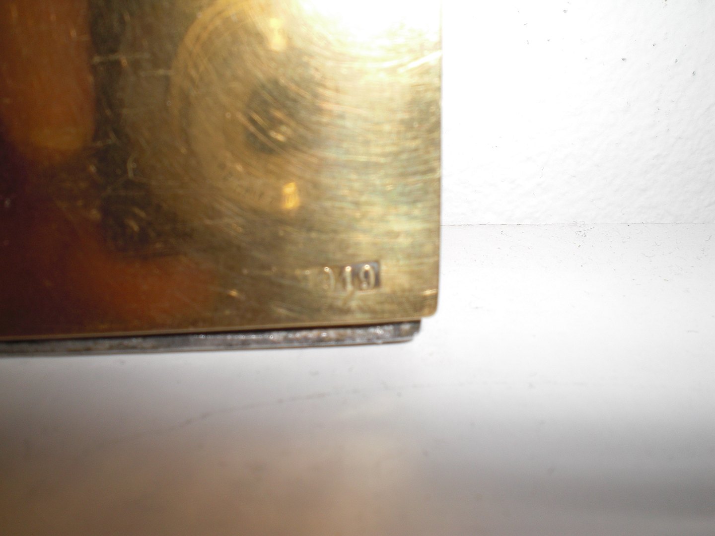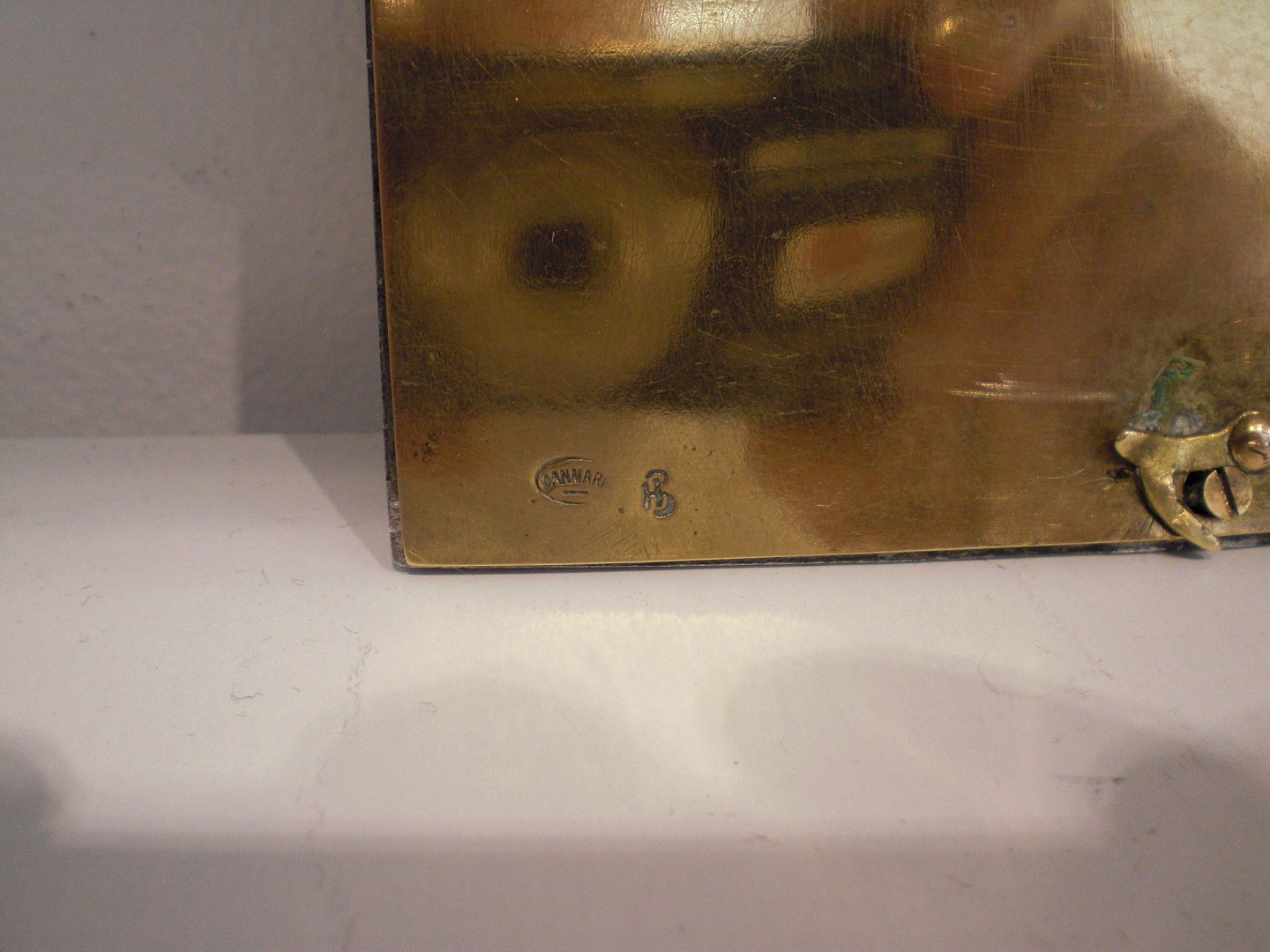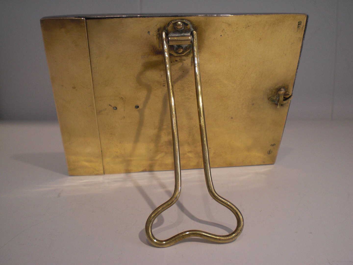 Glat, vandret, Mogens Ballins Eftf, tinramme med messingbagplade og stander. Stemplet HB, Danmark i oval Efter 1919. Ikke i Vejenbogen. I fin stand, med let slid, nyere skrue indsat - vendt tidligt fra lodret til vandret stander. Ydre mål: 15,2,6 x 11,5 cm.