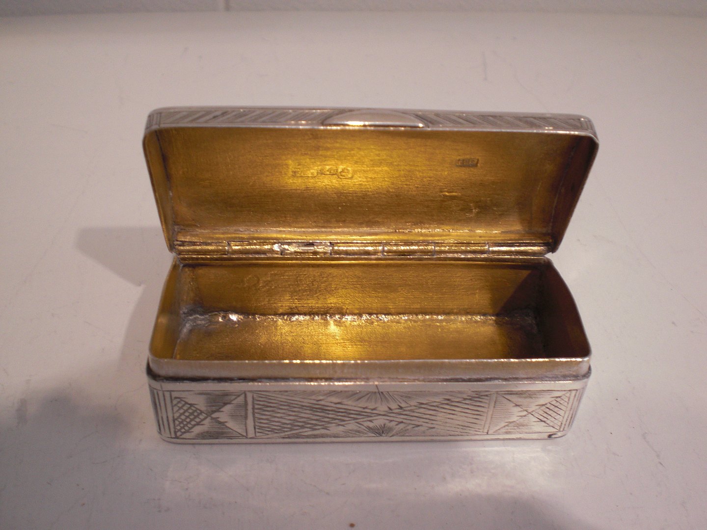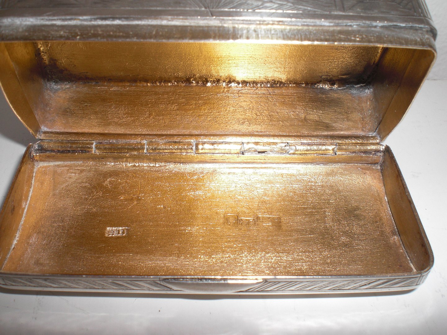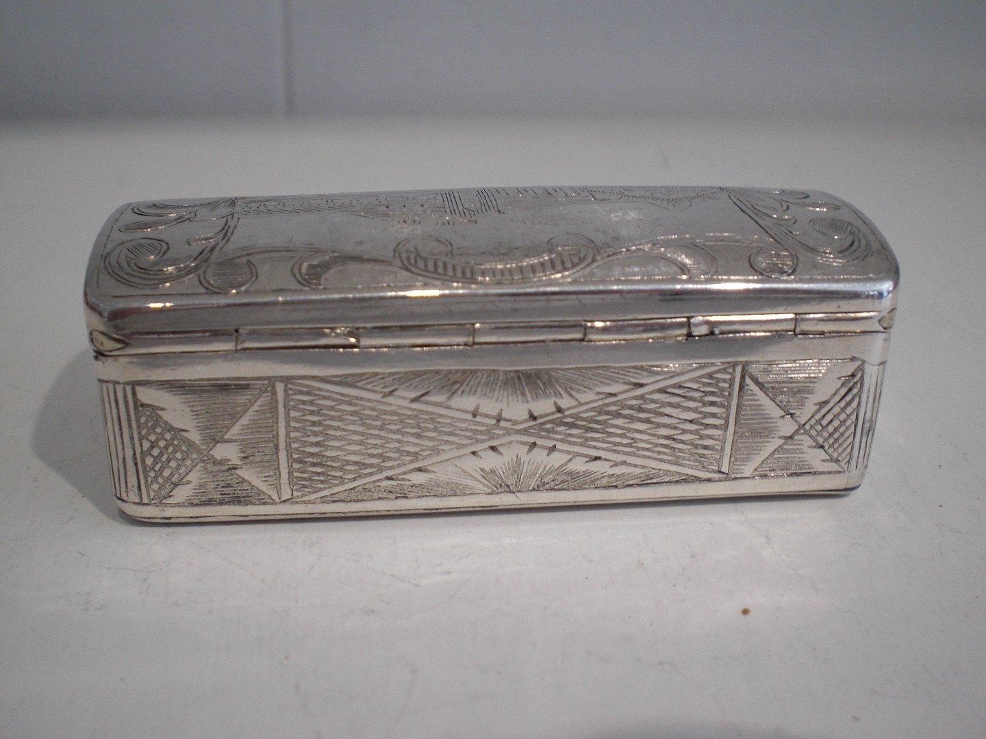 Vægtig russisk aflang sølvdåse (84 =0,875 sølv) fra 1858 - med svagt tydeligt mesterstempel, guareinstempel, lødighedsstempel og årstal i både låg og bund. Muligvis Ivan Vasileyvich Avdeyv, Moskva 1852 - 1862. Rundet låg, bygnings motiver i låg og bund og ornamentik på siderne. Gammel reparation i bud ellers tidstypisk brugsslid. Vægt: 72 gram. Mål: 7,3 x 3,3 x 2,5 cm.