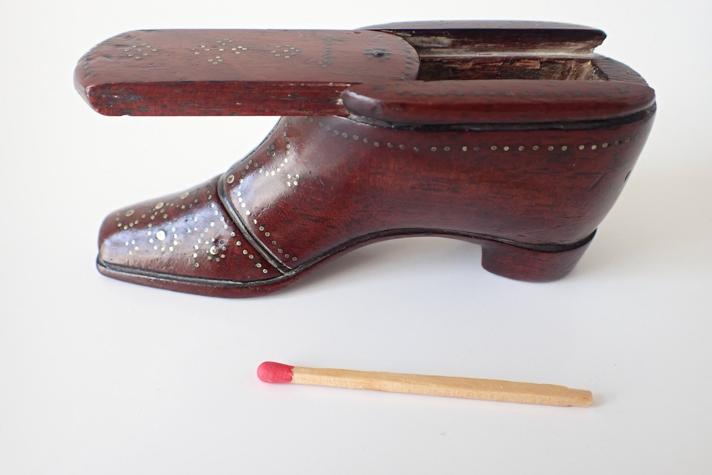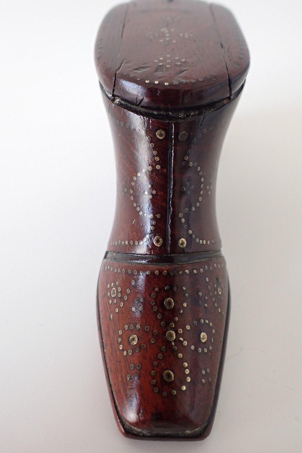 Engelsk snusæske formet som støvle. Udført i rosentræ med skydelåg og dekoration af små messingstifter forskellige mønstre og borter. 1800-tallett. Længde: 9,5 cm. Højde: 3,8 cm. Bredde: 3 cm. I meget fin stand.