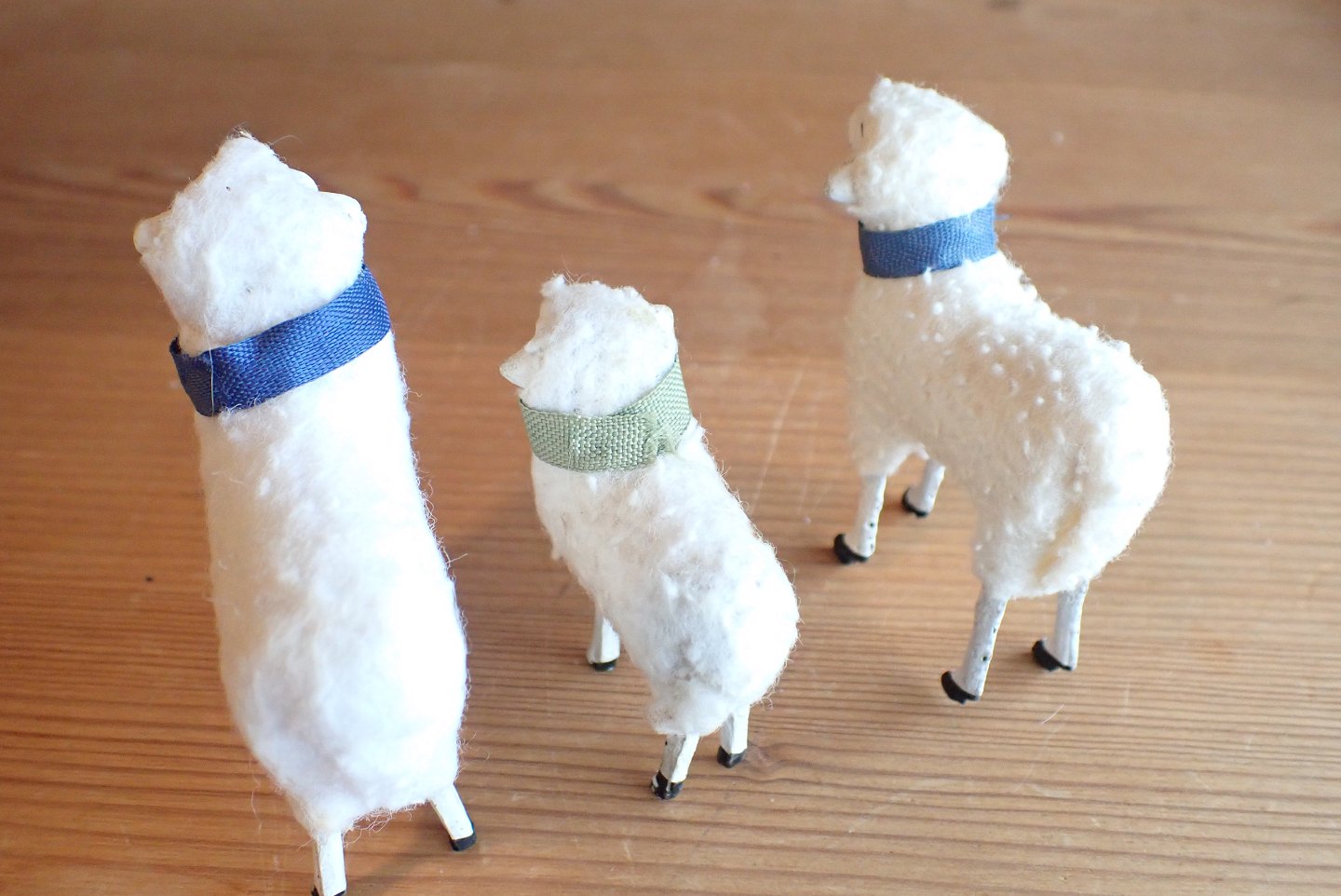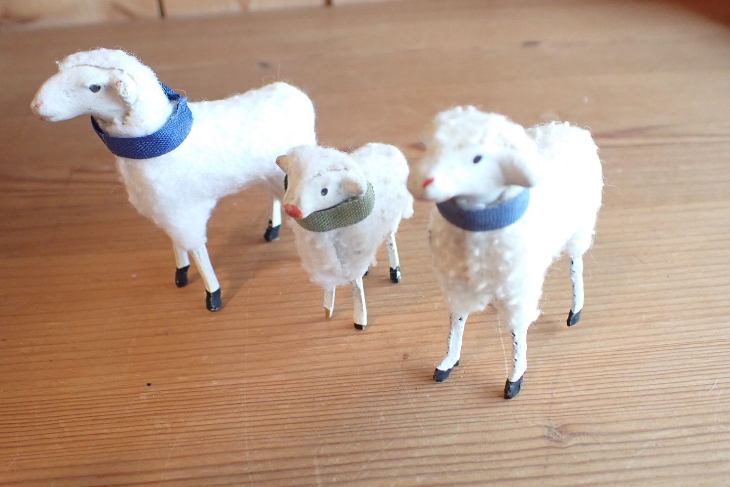 3 påskefår i træ og uld. 2 støre og en mindre.. Danske - fra ca. 1950-erne. Højde på de store: 6,1 cm., længde: 6,4 cm. Højde på den mindre: 4,8 cm., længde: 4,9 cm.