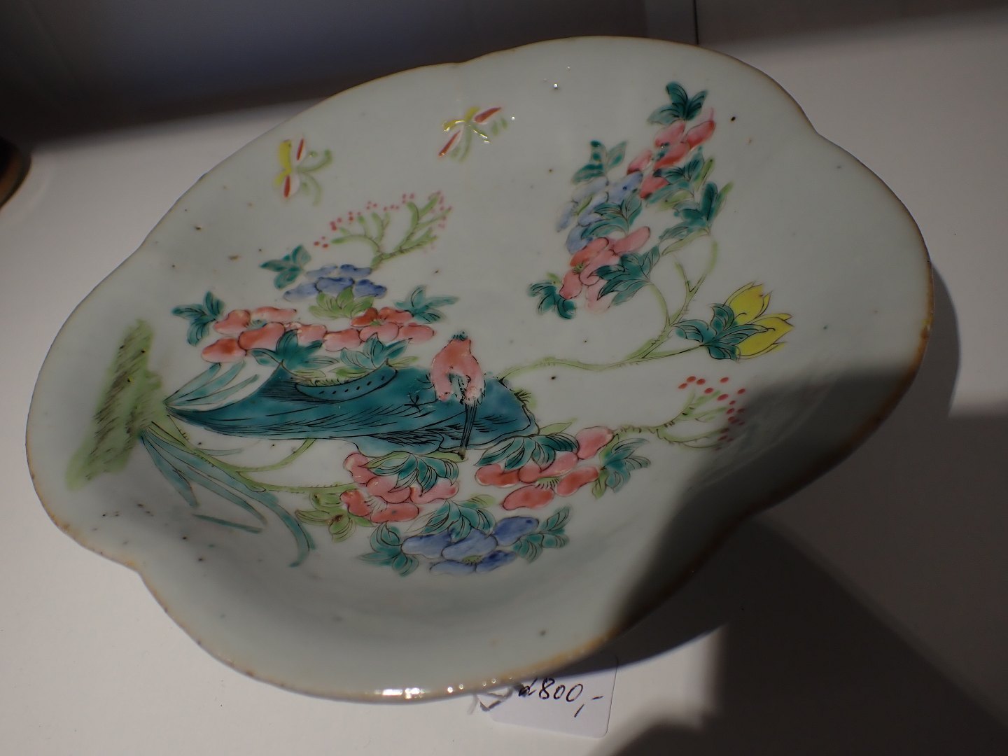 Kinesisk ferskenskål på fod med med 5 buer. Familie rose-dekorationer med fugl, blomster og insekter. Guan cheng Chêng (1723 - 1735). Diameter: 21,5 cm. Højde: 5 cm. I fin og hel stand..