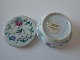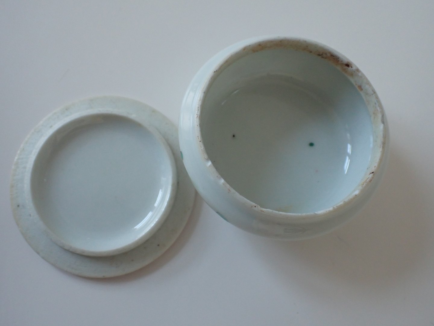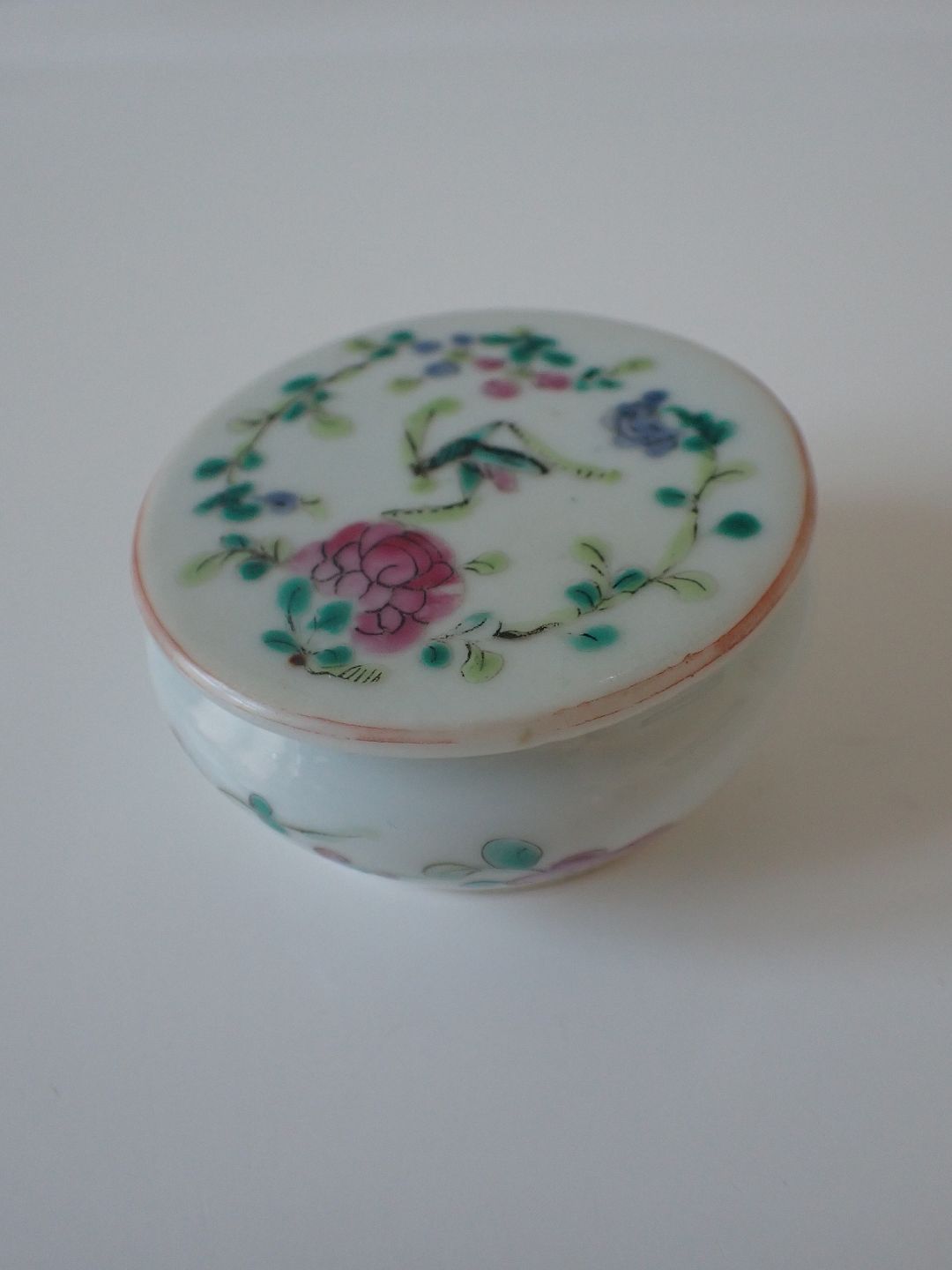 Kinesisk lågæske til sejlpaste i porcelæn med vårflue og blomster. Tao Kuang (1821 - 1850). Family Rose dekoration. Højde med låg: 3,7 cm. - dianeter: 6,8. I pæn tidstypisk stand med et meget lille skår i kant under låg.