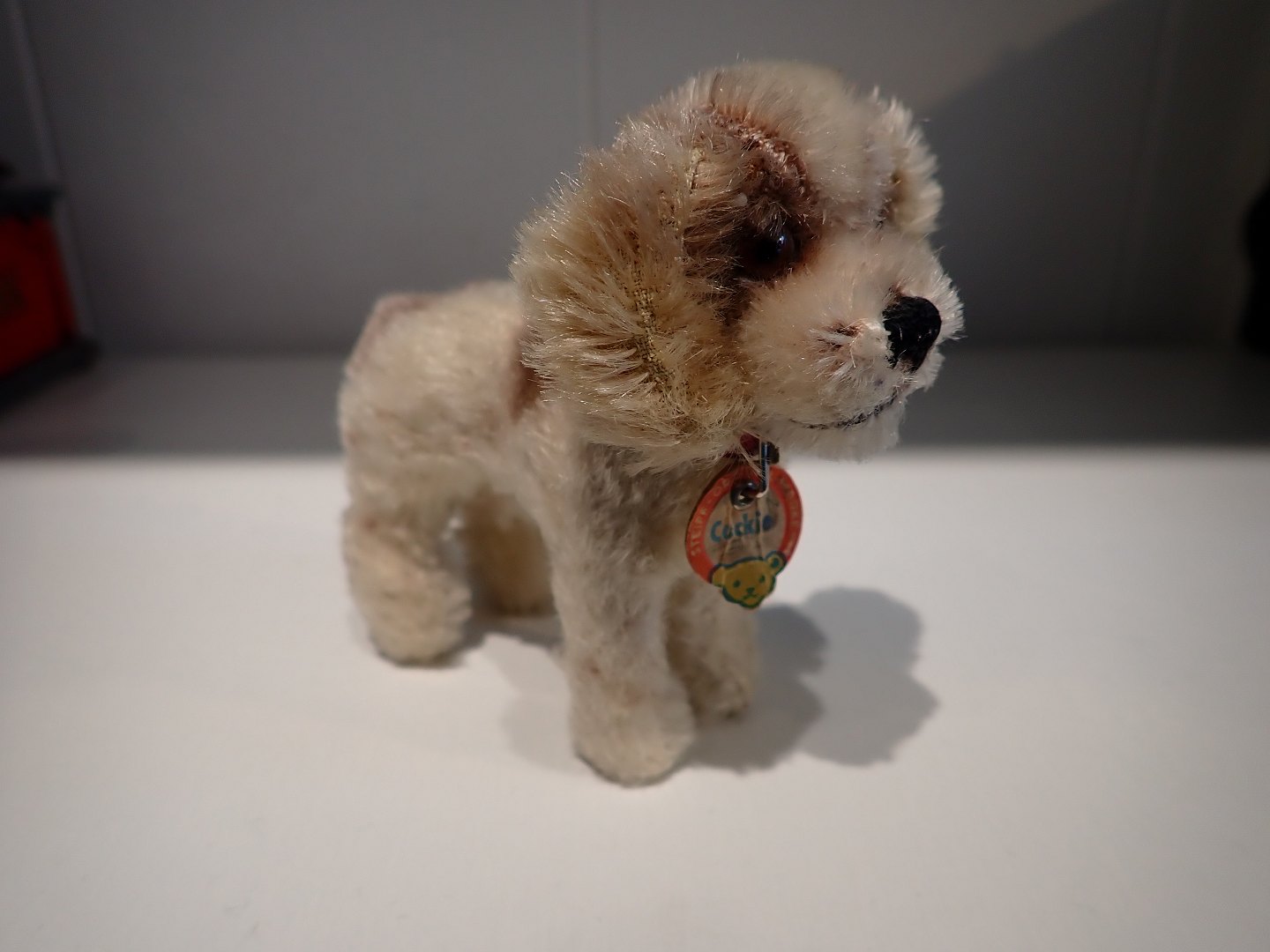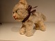 Til højre: Mini fox terrier med rødt halsbånd og Stieff mærke. Med glasøjne. Højde: 10 cm. Længde: 12 cm. I pæn stand med let slid. Pris: 485 kr.