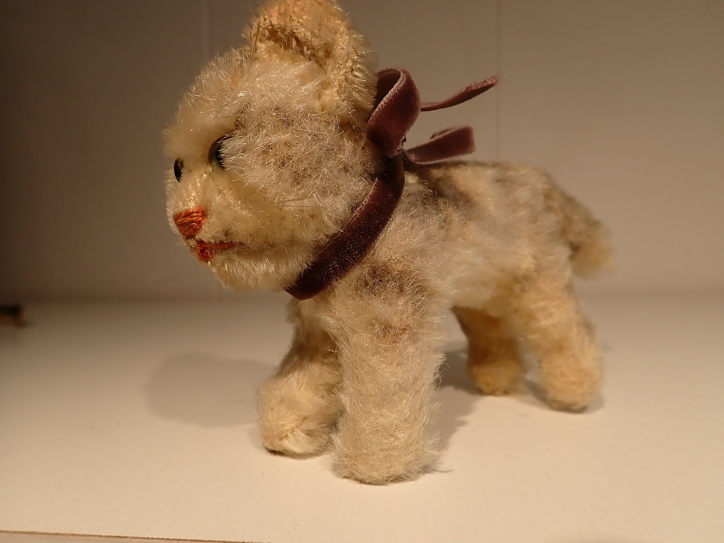 Til venstre: Mini stribet huskilling. Mangler Steiff mærkaten og halsbånd, erstattet med sløjfe. Med glasøjne. Højde: 9 cm. Længde u. hale: 10 cm. I pæn stand med let slid. Pris: 400 kr. .