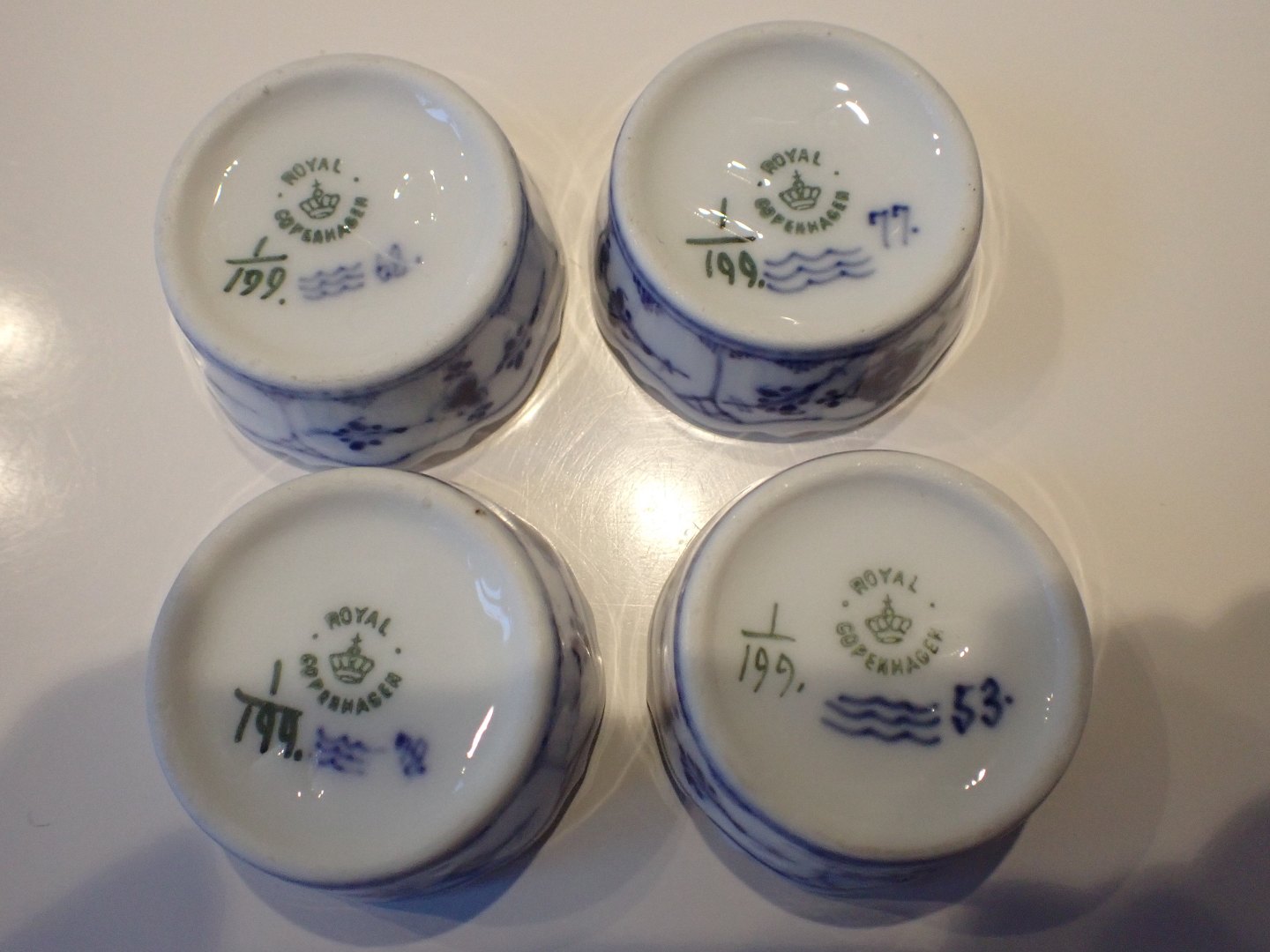 4 stk. kgl. Porcelæn - musselmalede, riflede saltkar. 1. sort. # 199. Efter 1923. Diameter; 4,3 cm. Højde: 1,8 cm. I fin stand. Sælges enkeltvis for 375 kr. pr. stk.