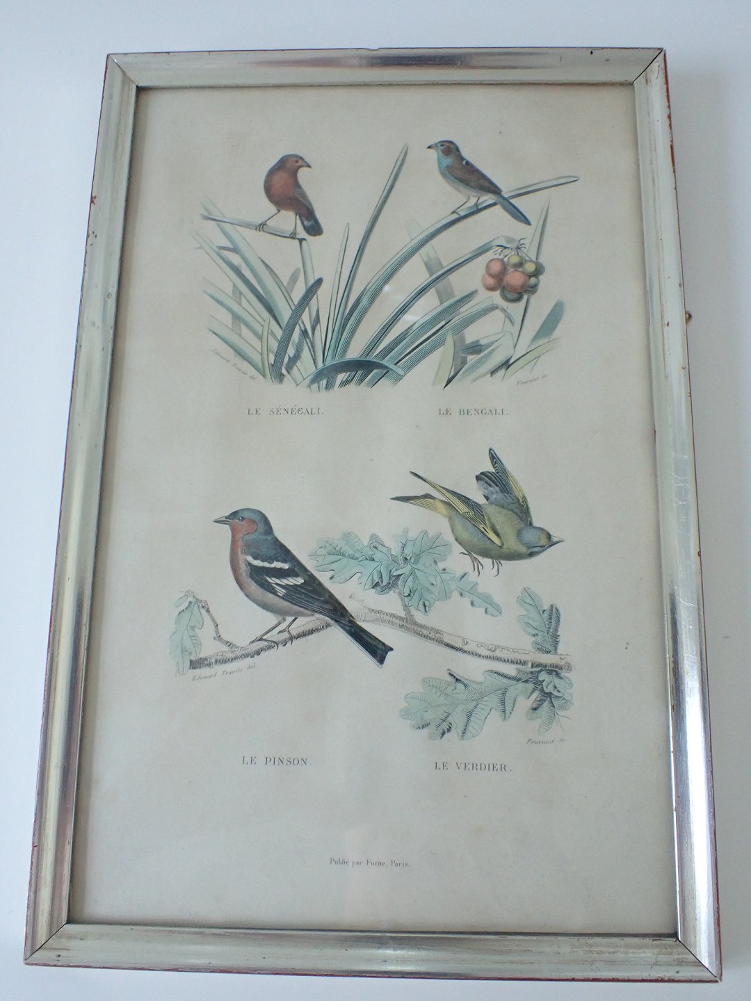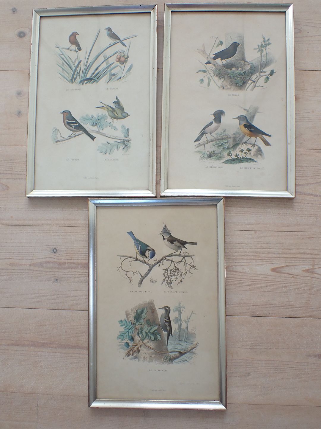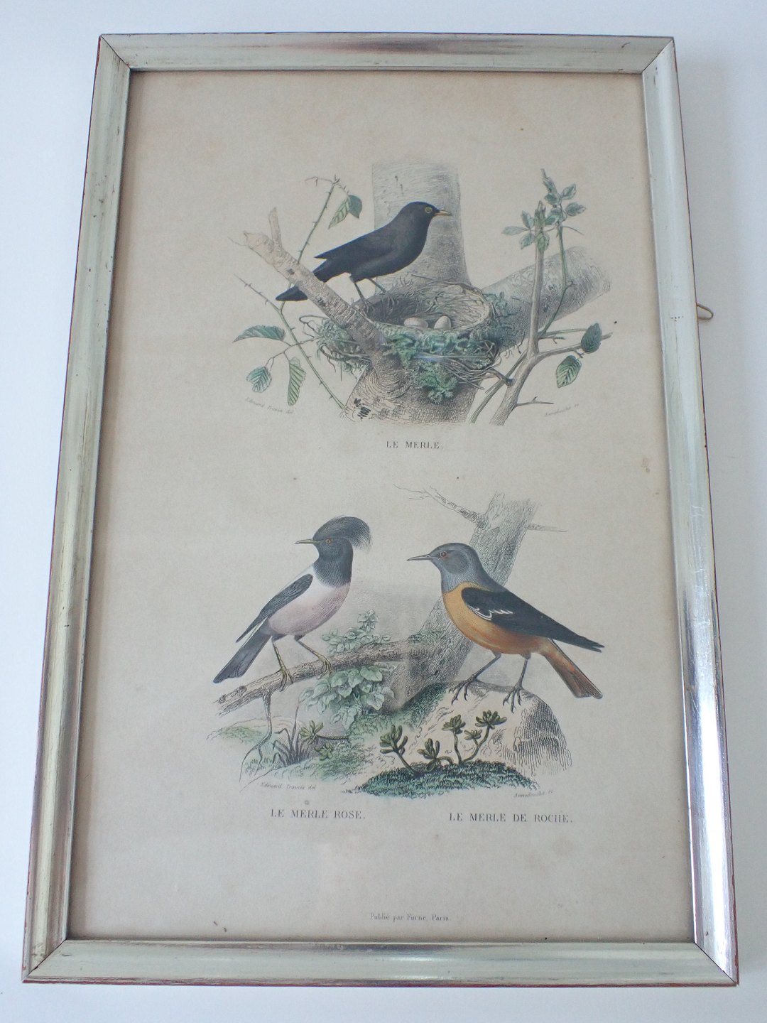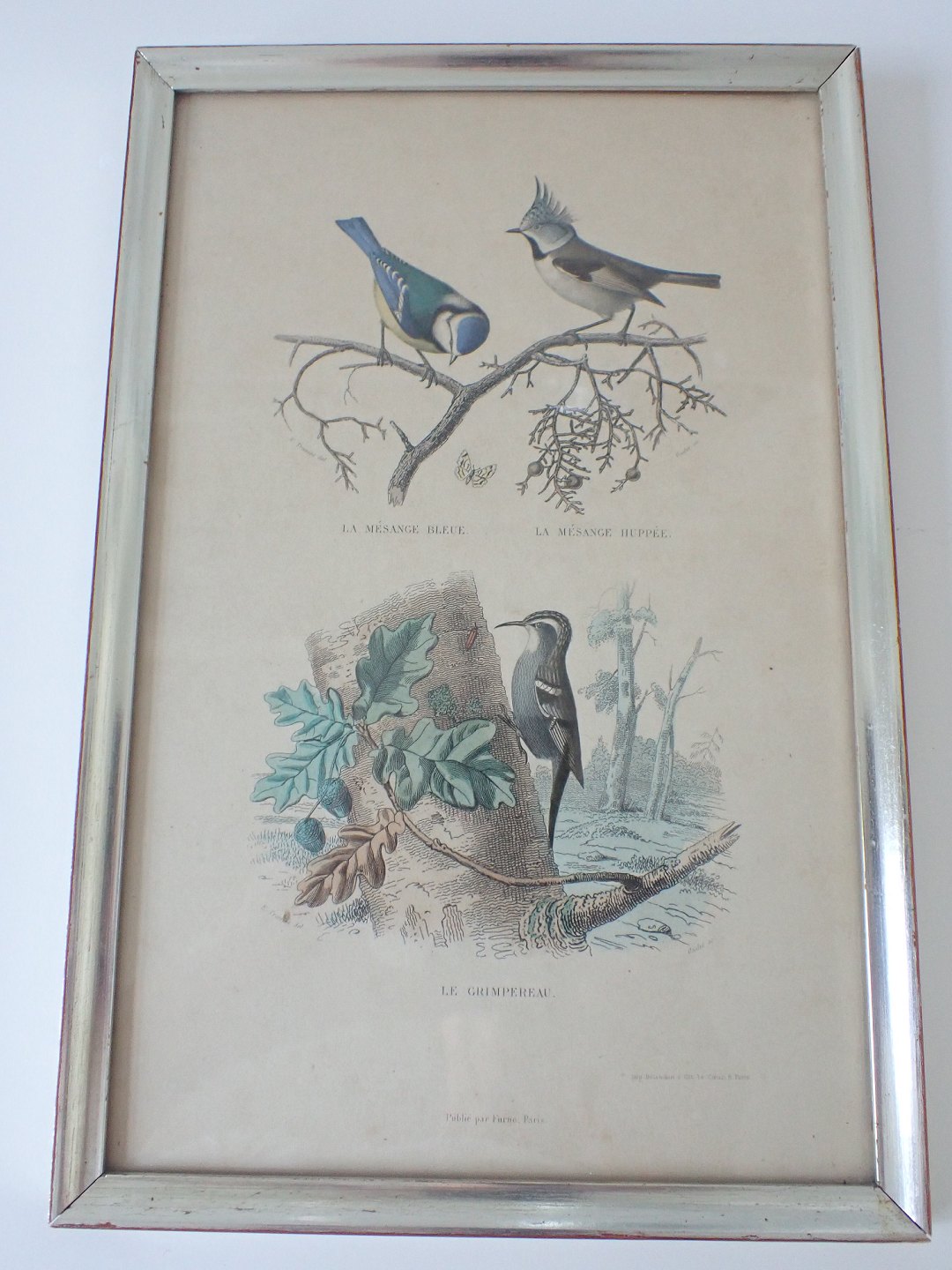 Edward Travies (1809 - 1876) - 3 indrammede fransk fugletryk: Mejser, drosler og finker. Publiceret af Furne, Paris i 1800-tallet. Mål med ramme: 26,5 x 17,5 cm. I pæn stand med meget let alderspræg.