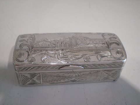 Lille rigt dekoreret fransk pilleæske i sølv med indvendig forgyldning. Ca.1820 Mester LG. Låget er dekoreret med pilekogger bladhang med oval til initialet. Sammenslyngede initialer JM. Kanter med riflet stileseret dekoration. Længde: 5,5 cm. Bredde: 3,7 cm. Dybde: 2,8 cm. Vægt: 23 gram. I fin stand - flot indvendig forgyldning.