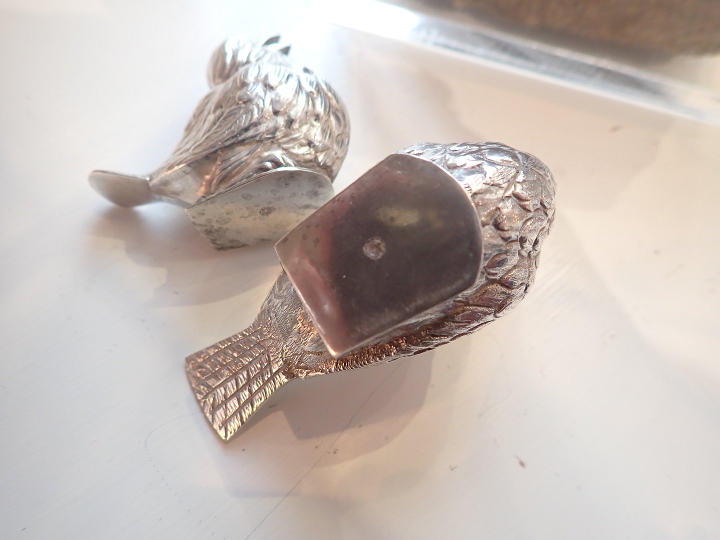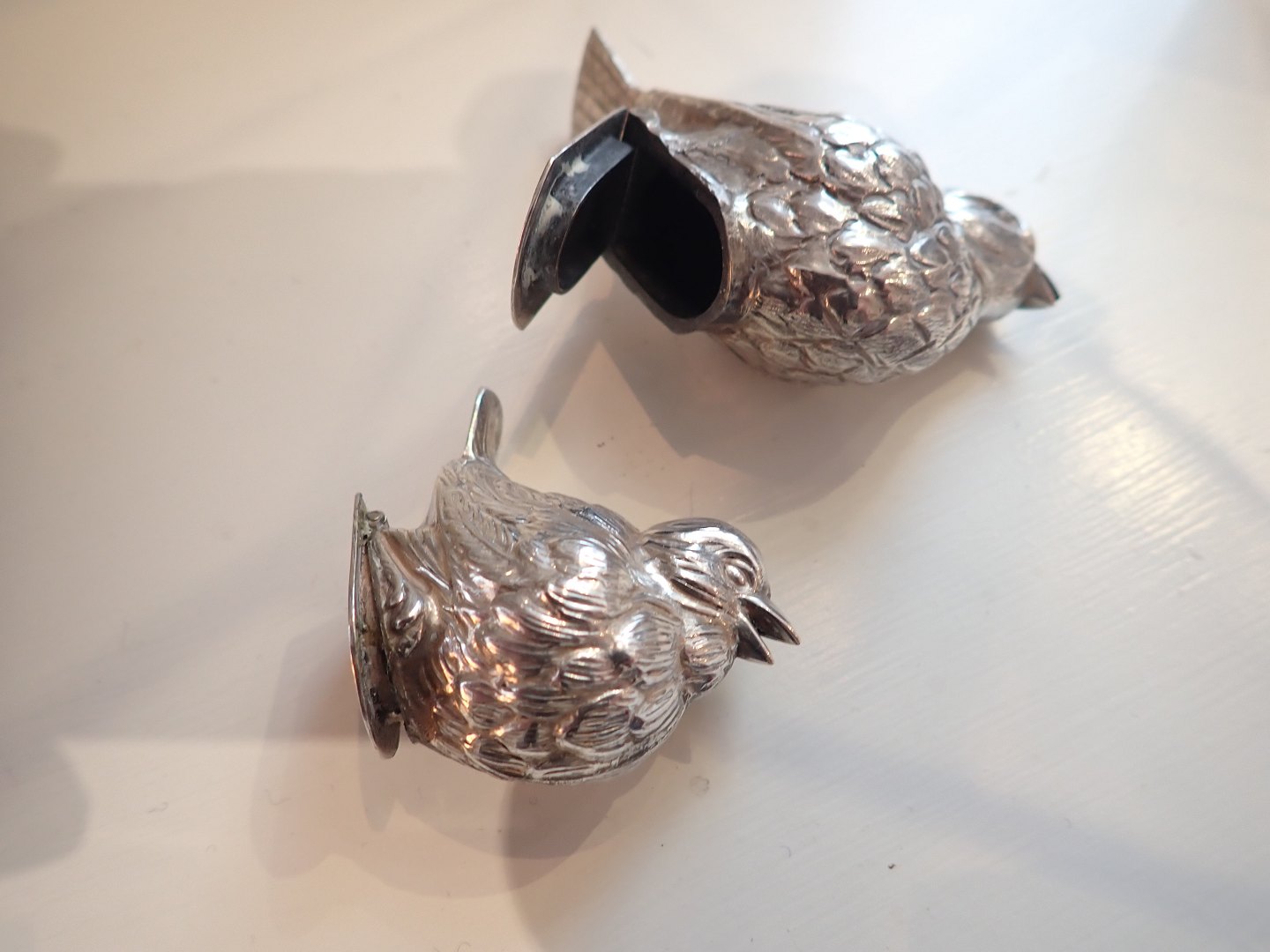 To salt-/peberbøsser i sølv i form af fugle. En større og en mindre. Begge med låge i bund og strøhul i næb. Mexicanske sølvstempler. Længde: 7 og 5 cm. Samlet vægt: 90 gram. I fin stand med mindre brugsspor. Sælges som sæt.