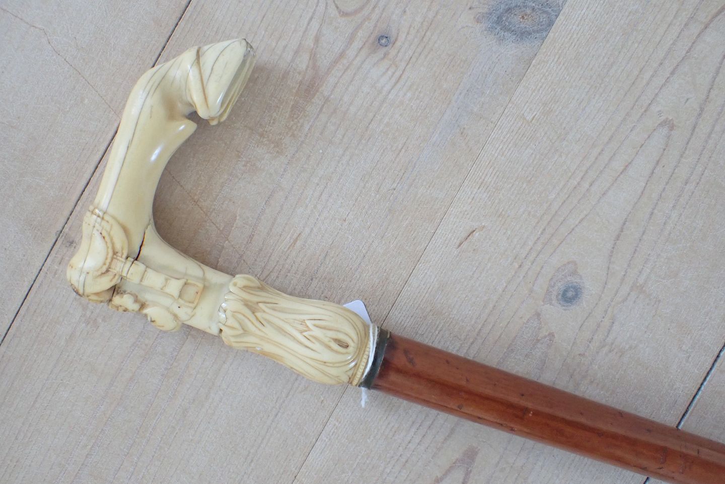 Stok med greb af udskåret elfenben i form af et hesteben sat med metal på en malakkastok med dupsko af gummi. Engelsk? ca. 1880. Længde. 82,7 cm. Sælges med Cites-certifikat. Pæn med tidstypisk slid.