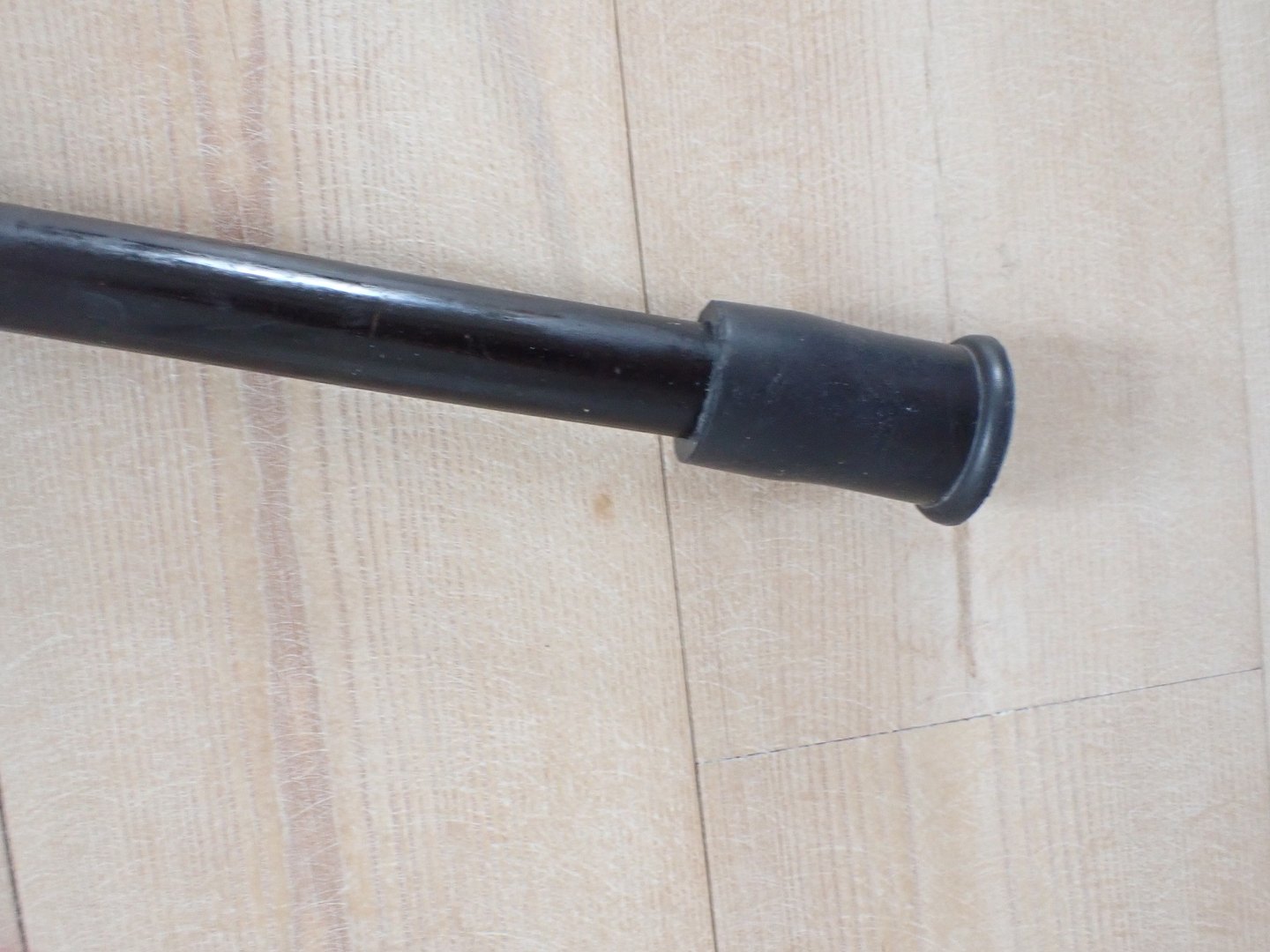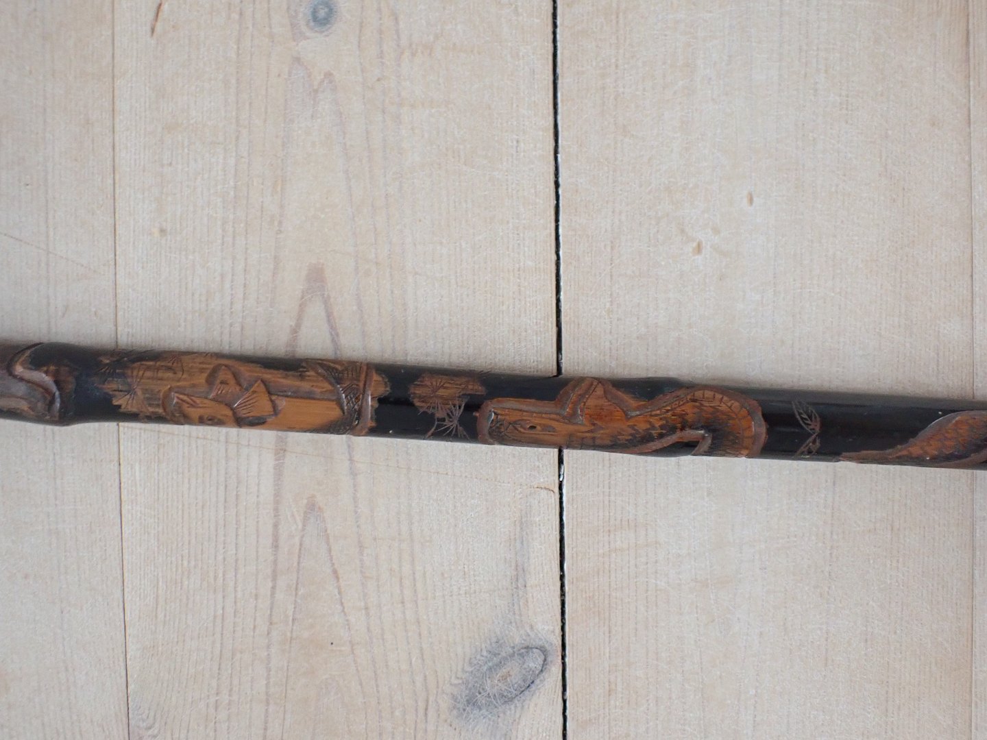Japansk stok med knop i malet, udskåret bambus, med blomsterdekoreret knop af ben og med nyere dupsko af gummi. Udskæringerne på stokken fore stiller aber, en fisk og en snoende drage. Ca. 1920. Længde: 90,5 cm. I pæn stand o forhold til alder med let slid.