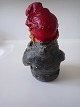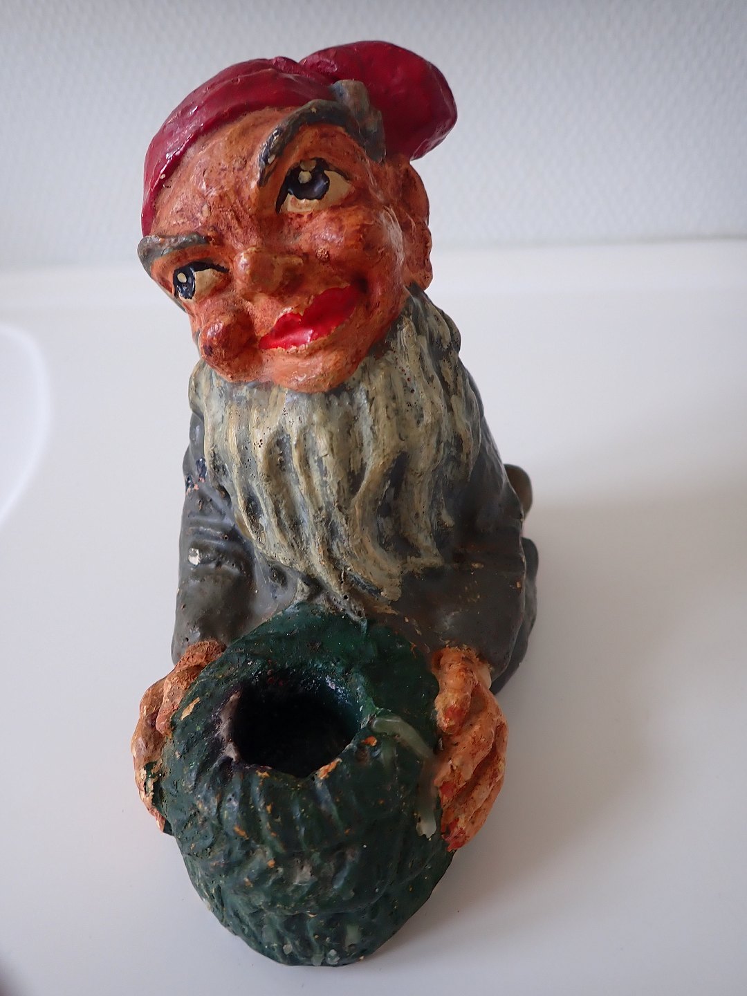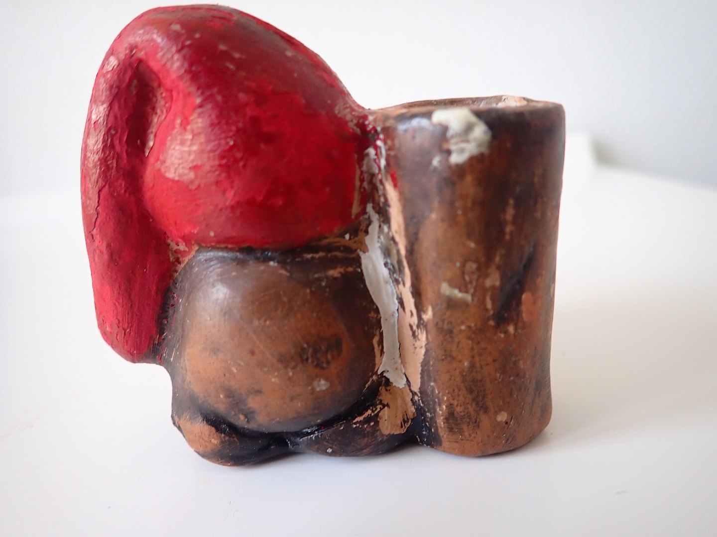 Til venstre: siddende nisse med lysholder. Højde: 13 cm. bredde: 13,5 cm. I pæn stand med lidt afslag. Solgt.