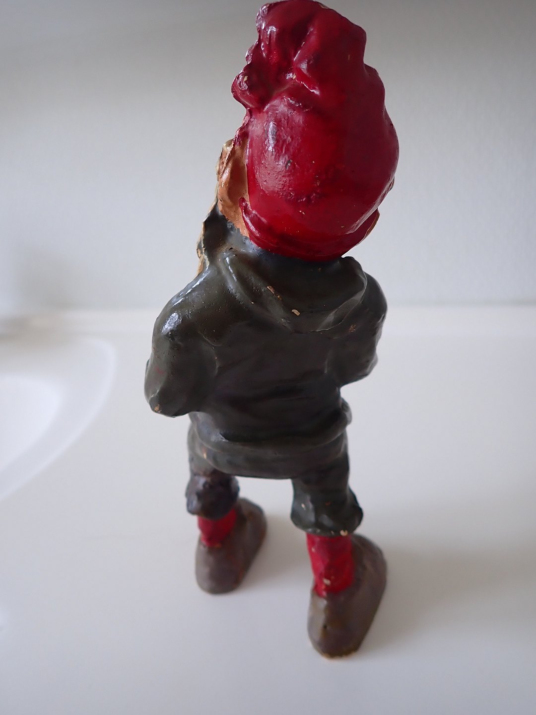 Forest i midten: Lille nisse med lysholder. Højde: 5,5 cm. I lidt slidt sand med lidt flad næse. Pris: 150 kr.