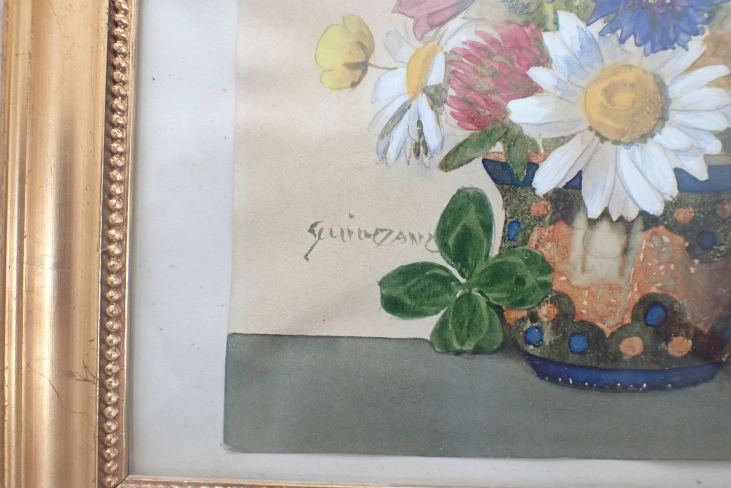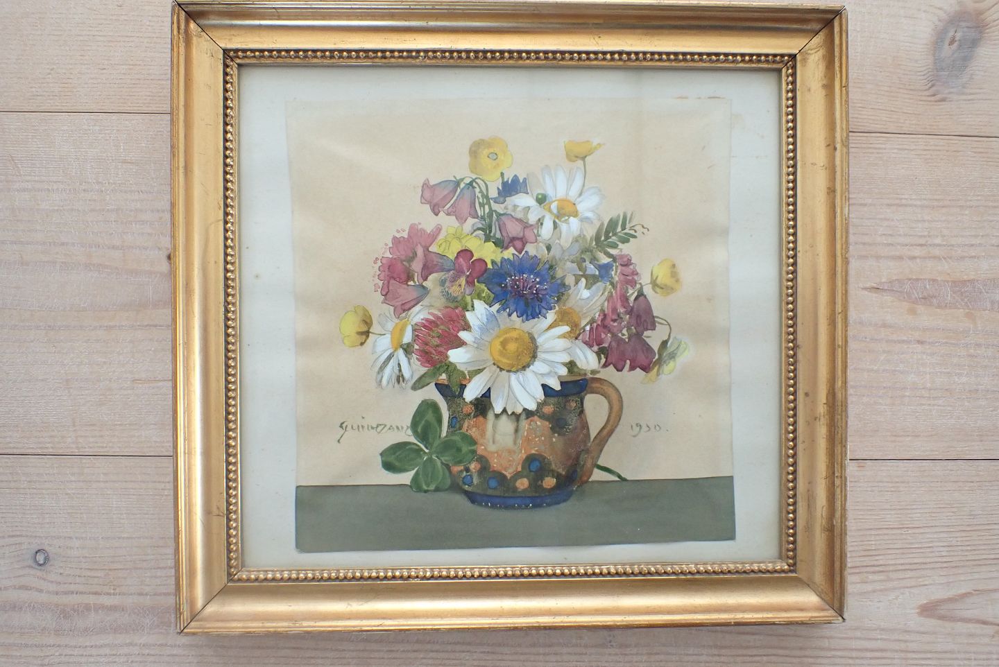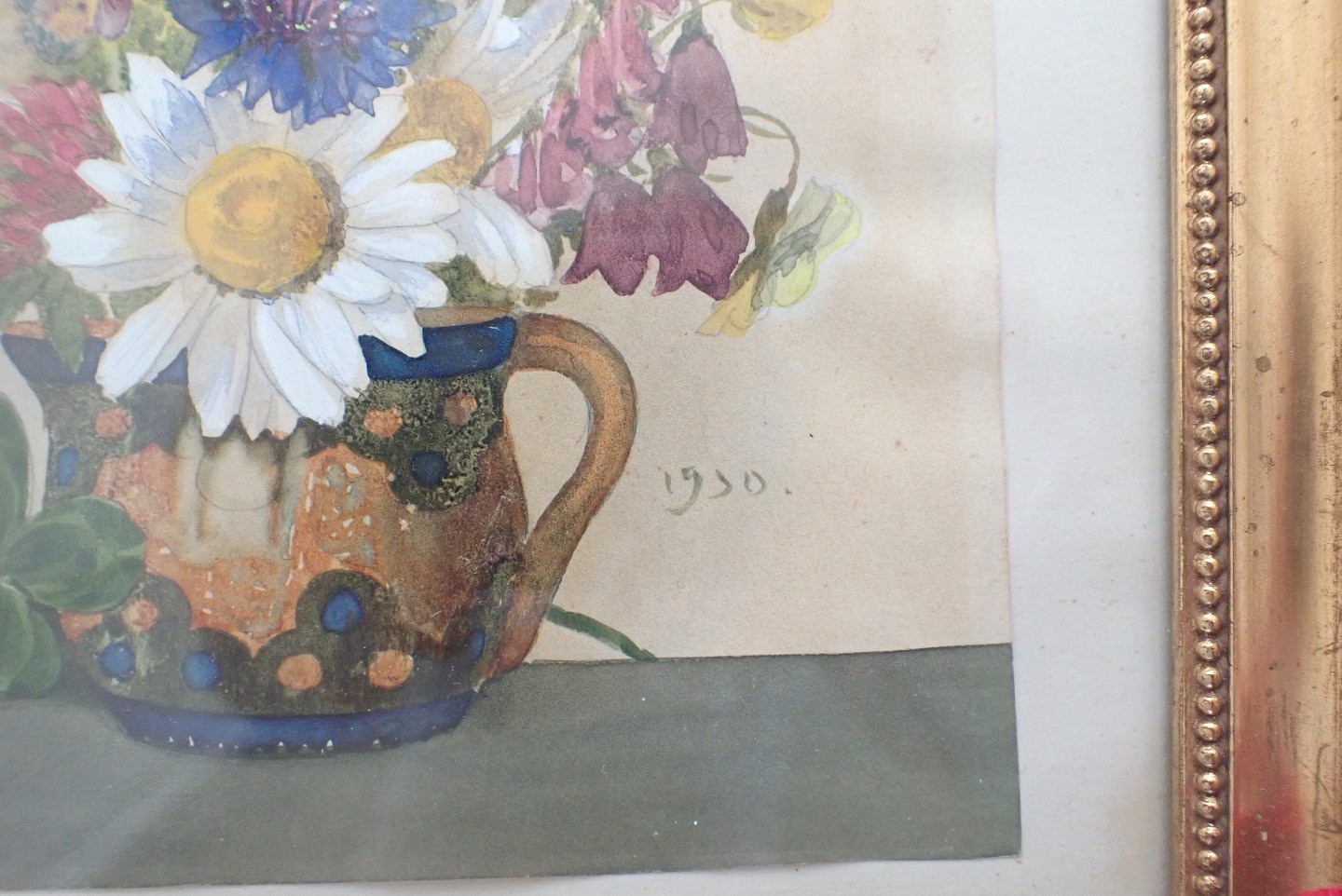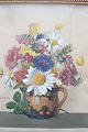 Lille indrammet fransk akvarel med blandet blomsterbuket i en broget kande. Signeret og dateret 1930. Indre mål: 14,3 x 14 cm. Ydre mål: 19,3 x 20,5 cm. I pæn stand i forhold til alder.