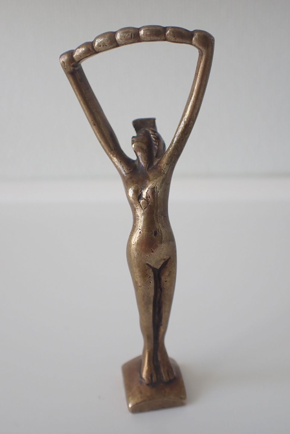 Bronzeoplukker i form af en nøgen kvinde. Dansk ca.1930. Højde: 9,7 cm. Vægt: 75,2 gram. I pæn tidstypisk stand.