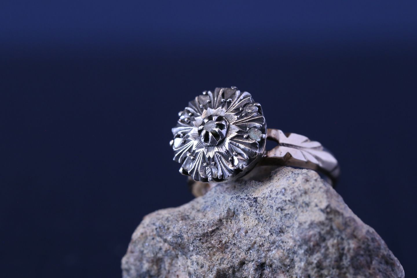 Beautiful and unique gold ring in 8 carat white gold, with a beautiful pattern like a flower and inlaid diamonds. There is a beautiful pattern engraved on the ring itself, so it appears dynamic and alive. The ring can be worn either alone or in combination with other rings.
