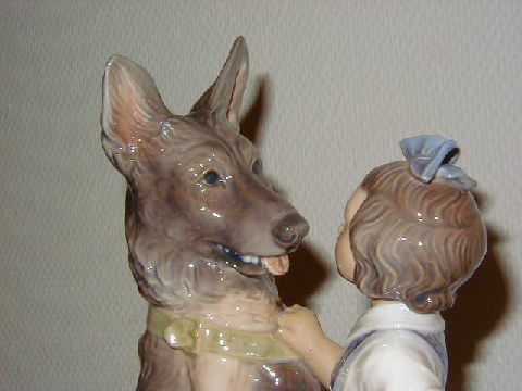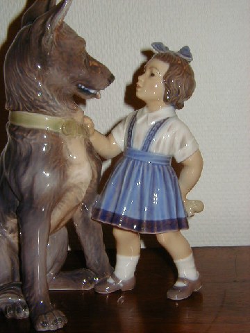 Stor Dahl Jensen Figur, Pige med Schæferhund. Dekorationsnummer 1213, 1. sortering, mål 21 x 26 cm. Smukt dekoreret. Absolut fejlfri.