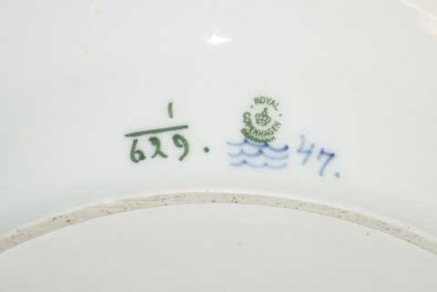 Kongelig Musselmalet Halv blonde, Ovalt fad, Fiskerist nr.110 bruges Modellør: J.Jacobsen November1893 Dekorationsnummer 1/629 2.Sortering Længde 44 cm. Bredde 33,5 cm. Flot og velholdt.