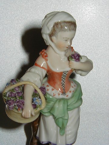 Rare and Antique Royal Copenhagen Girl Figurine in Overglaze. Extremely well decorated and sculptured Height 12 cm. Factory second All the flowers are in perfect condition