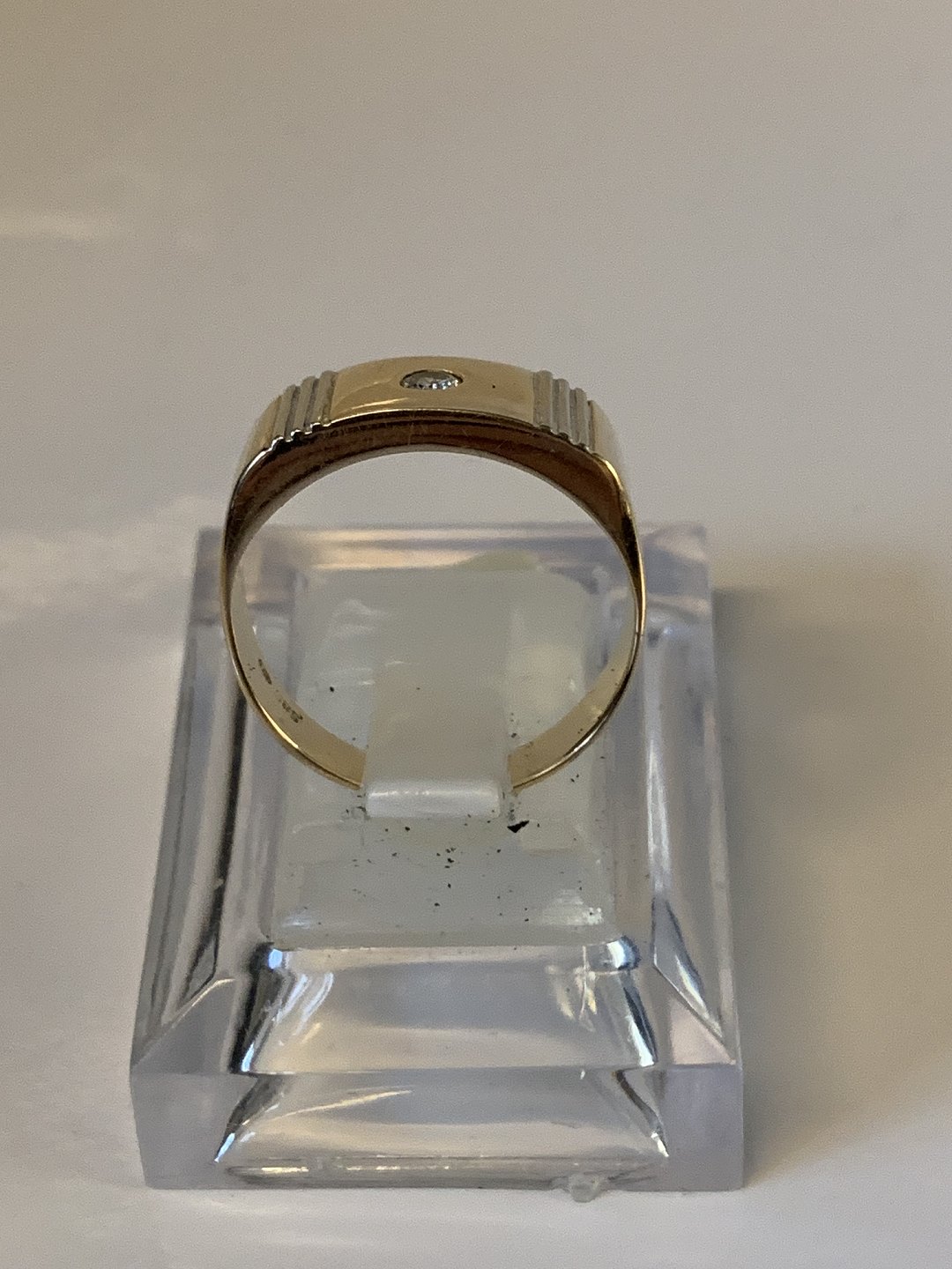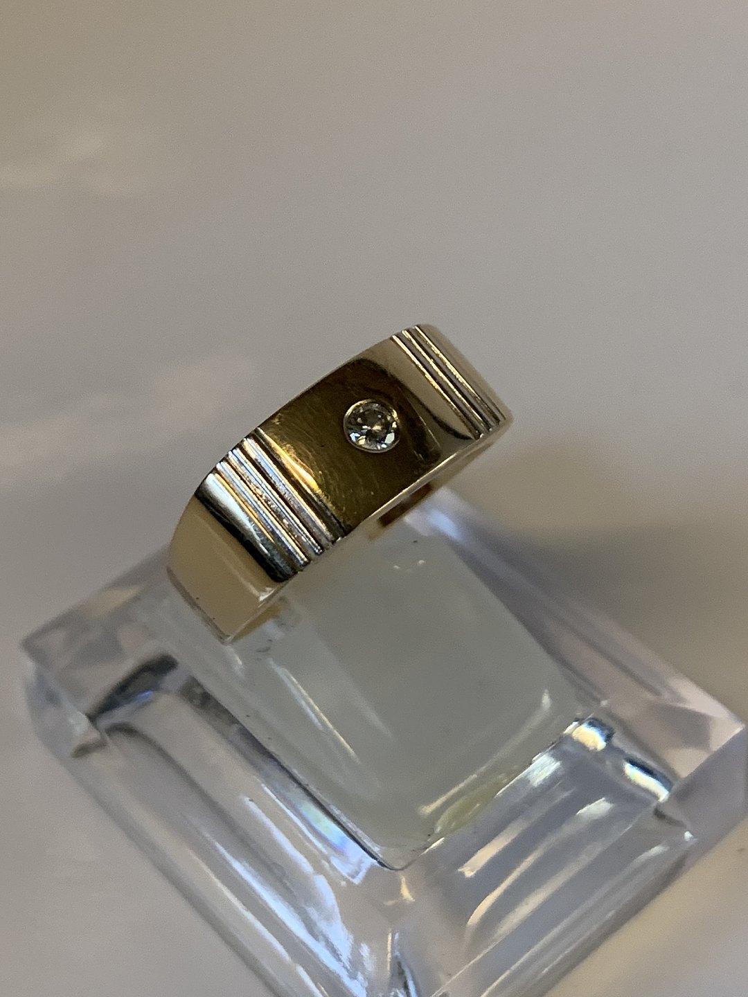 Signetring med en diamant i 14 karat guld. Stemplet KH 585. Størrelse 57. Pæn og velholdt stand. Tjekket af guldsmed, Smykket findes ikke fysisk i butikken, men kan fremvises efter ønske. Kontakt os gerne for en fremvisning
