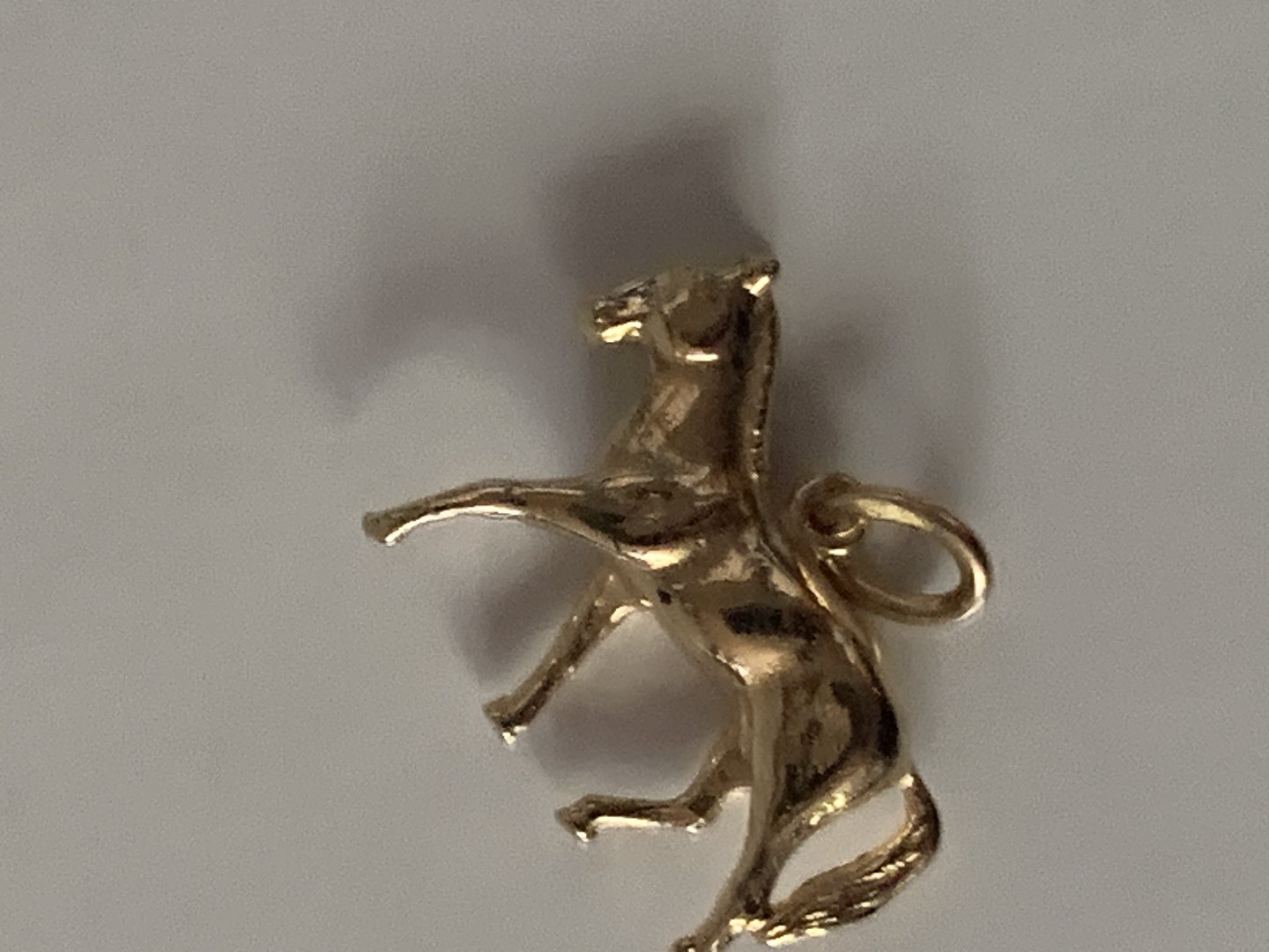 Heste Vedhæng #14karat Guld Stemplet 585 Højde 15,47 mm Brede 21,04 mm Pæn og velholdt stand Både vores Guld og Sølv tjekket af guldsmed og findes ikke fysisk i vores butik, kontakt os for info eller fremvisning