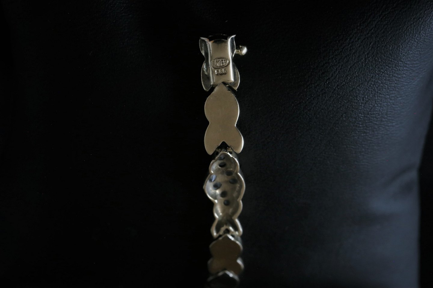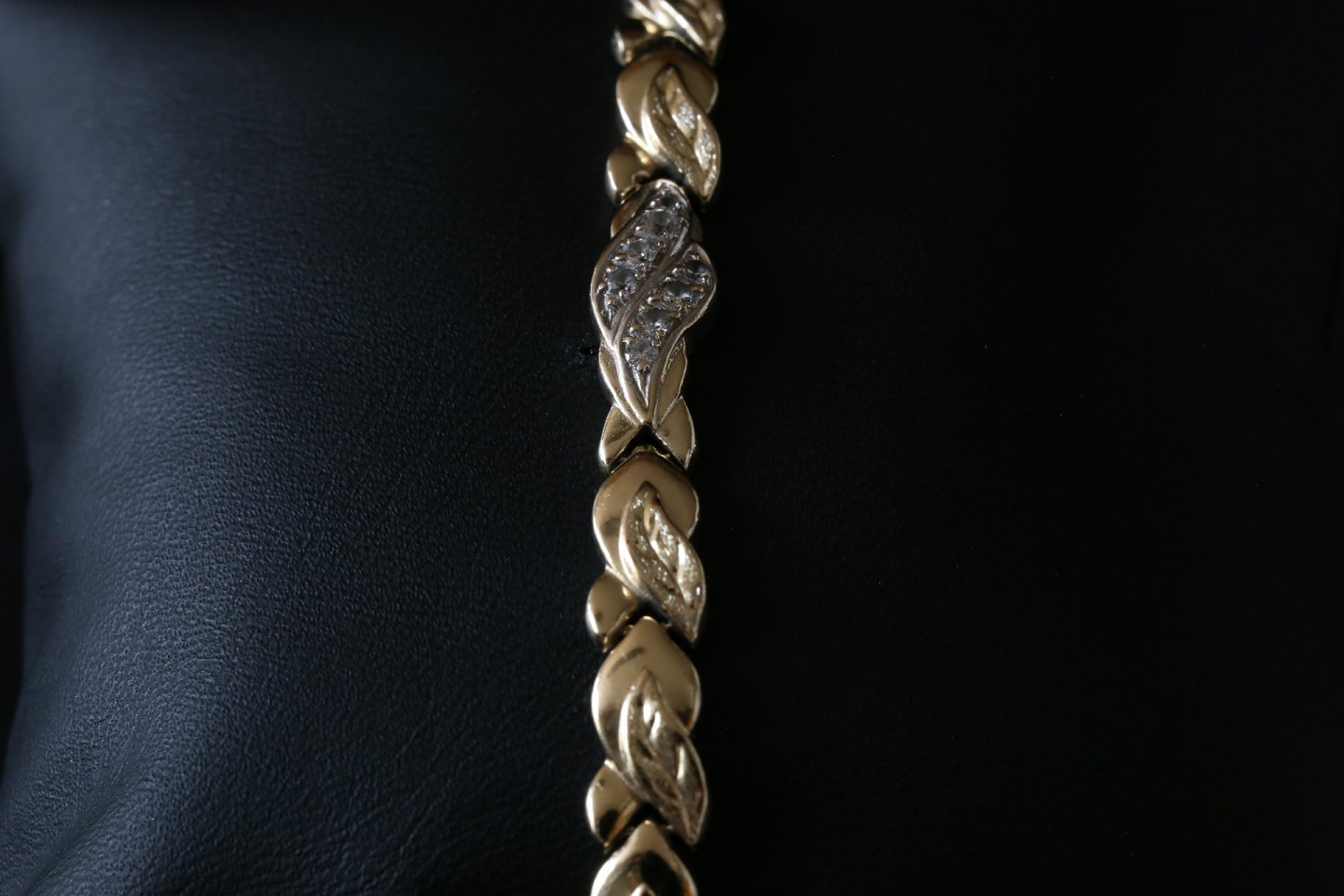 Dette guldarmbånd er flot og elegant. 14 karat 585 guld. Det er smedet med detaljeret led, og smukke indlagte sten. Hvert led er lavet som et lille blad. Armbåndet er stilet, og passer til en smuk kjole.