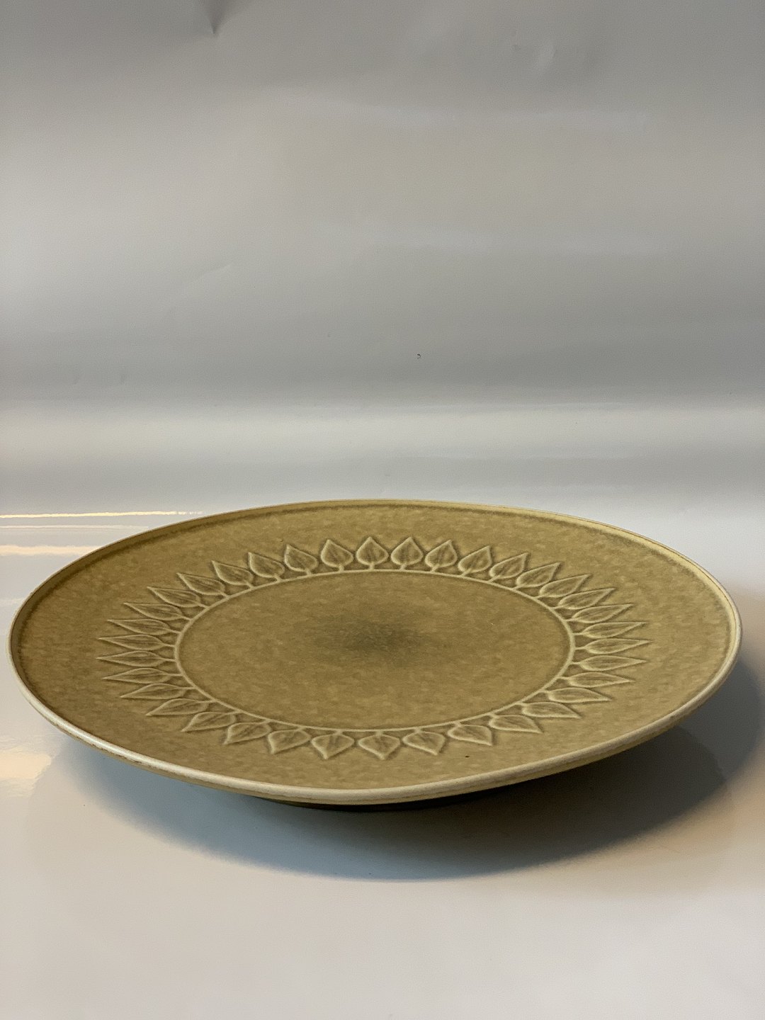 Bing & Grondahl/Nissen/Kronjyden, Relief stoneware, round dish on a low foot. Designed by Jens Harald Quistgaard. Length 26.7 cm. Perfect condition.