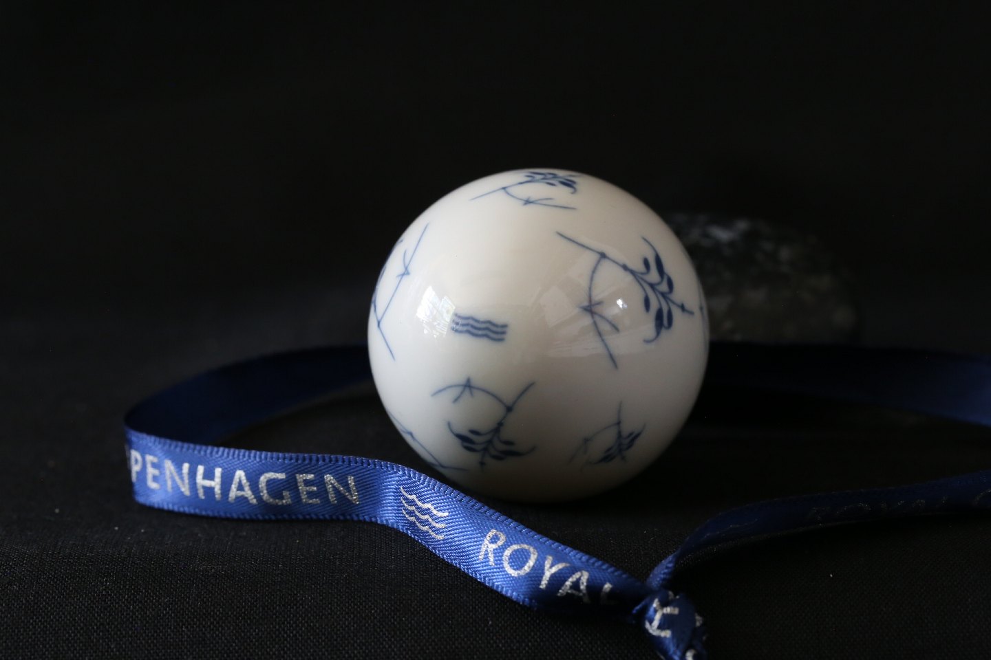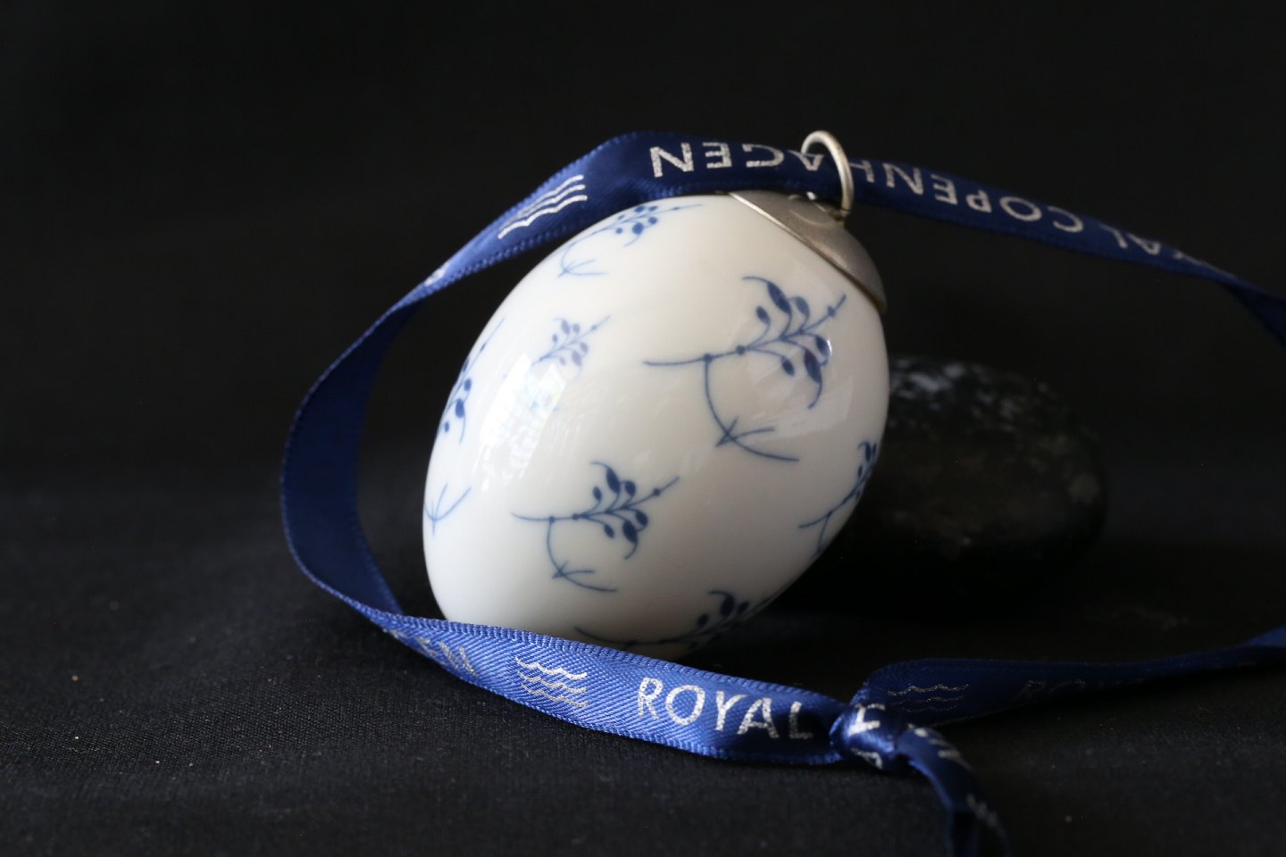 Musselmalet påskeæg fra Royal Copenhagen, med bånd. Smukt og stilrent.