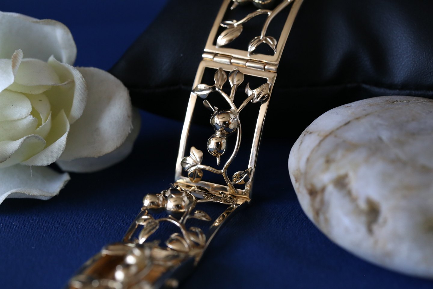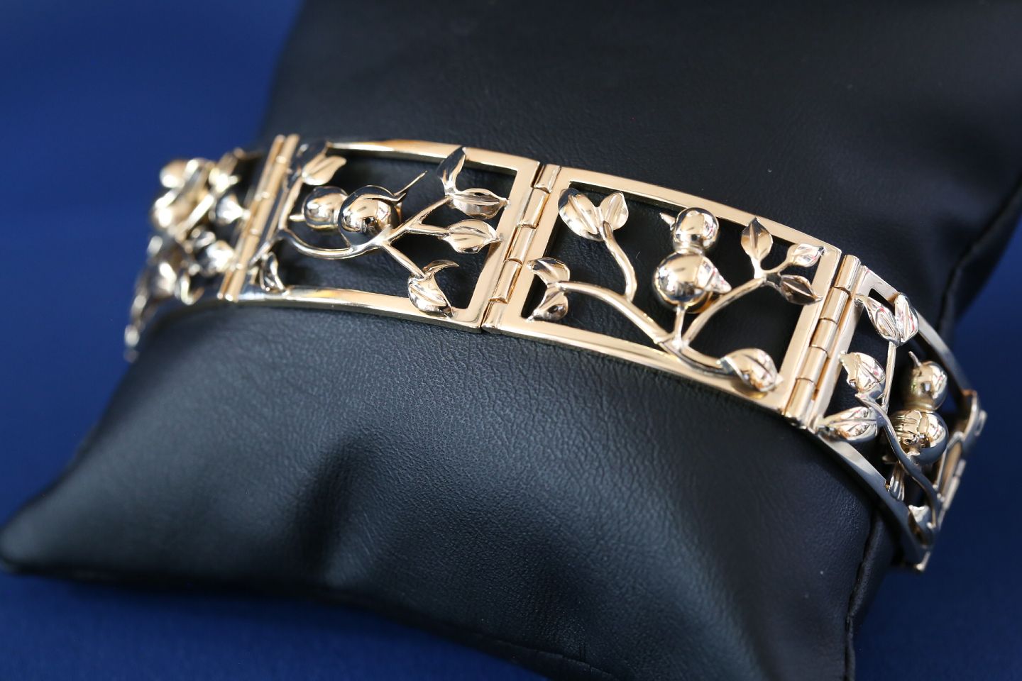 Eksklusivt guldarmbånd i 14 karat guld. Armbåndet har en flot struktur, og mange flotte detaljer. Armbåndet består af stor led, hvori der er indstøbt forskellige motiver. Dette guldarmbånd er noget ganske særligt, og vil passe til festen eller bryllup, hvor det vil gøre godt indtryk.