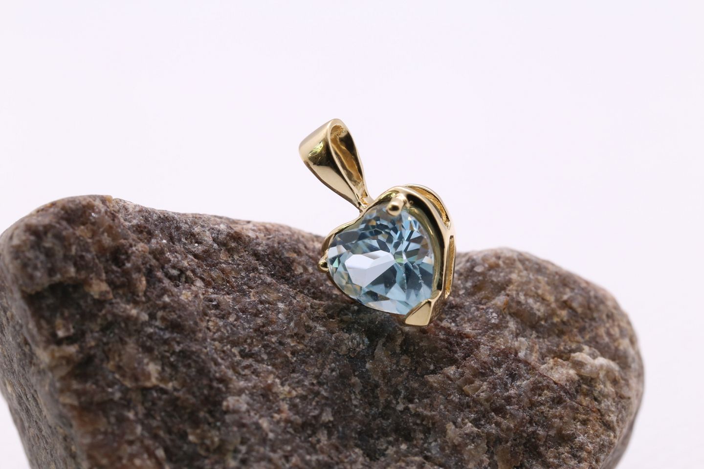 Beautiful small heart-shaped pendant in 14 carat gold, with inlaid blue stone. The small pendant will fit perfectly in a thin chain around the neck, and it will be discreet but at the same time elegant. The pendant is designed elegantly and minimalistic, and gives the pendant a nice look. Can be advantageously combined with a gold bracelet.