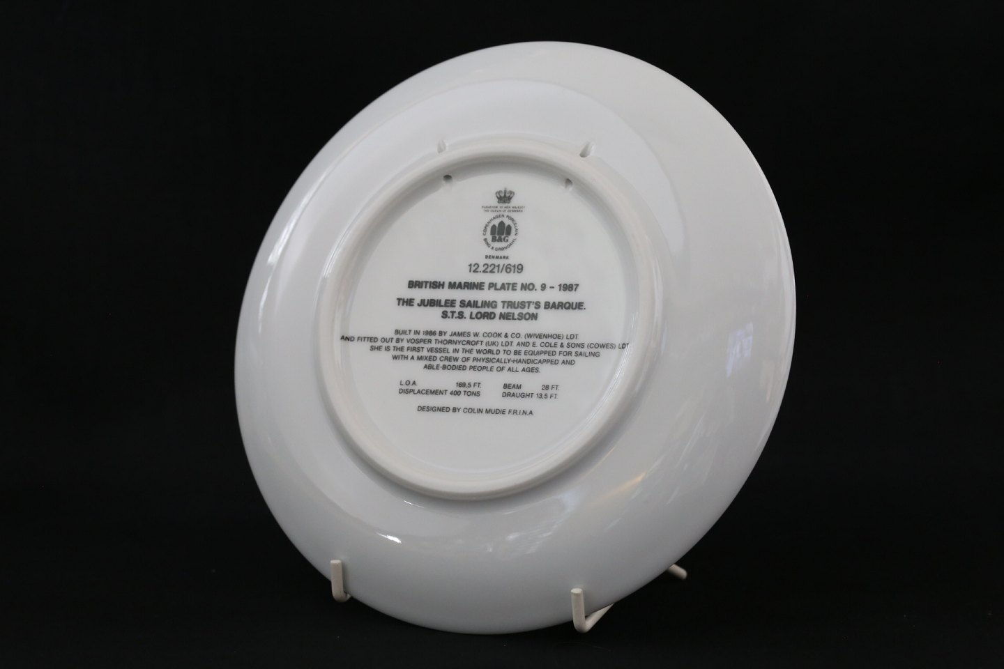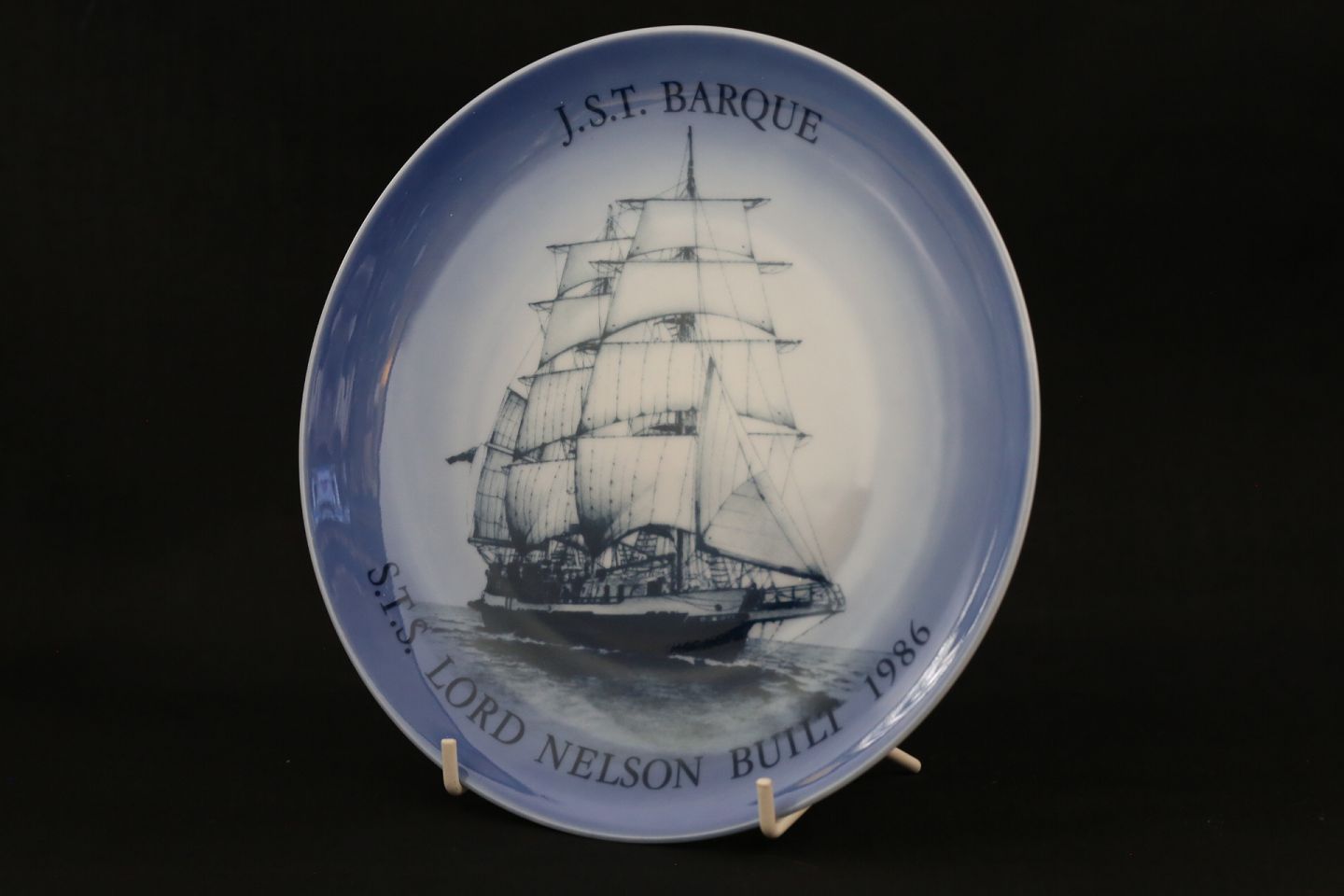 Ship plate Bing & Grøndal, No. 9, from 1987. The plate is painted with J.S.T. Barque, with the text S.T.S. Lord Nelson Built 1986. There is text about the ship on the back of the plate.