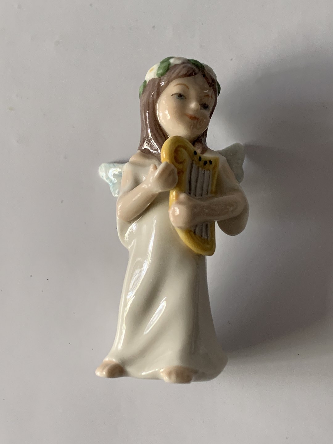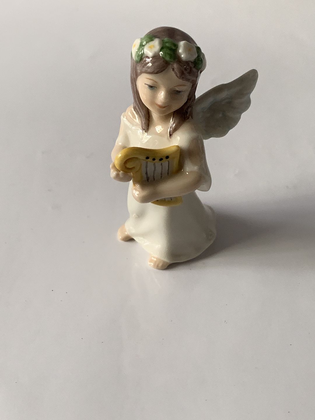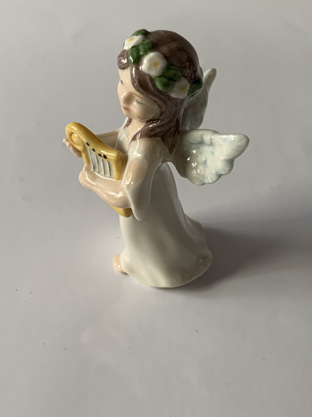 Smuk lille porcelænsfigur fra Royal Copenhagen, Engel med harpe. Figuren er udført med flotte detaljer og bløde former, der gør figuren harmonisk og smuk at have stående i hjemmet. Figuren er designet af Sven Vestergaard, og er 1. sortering.