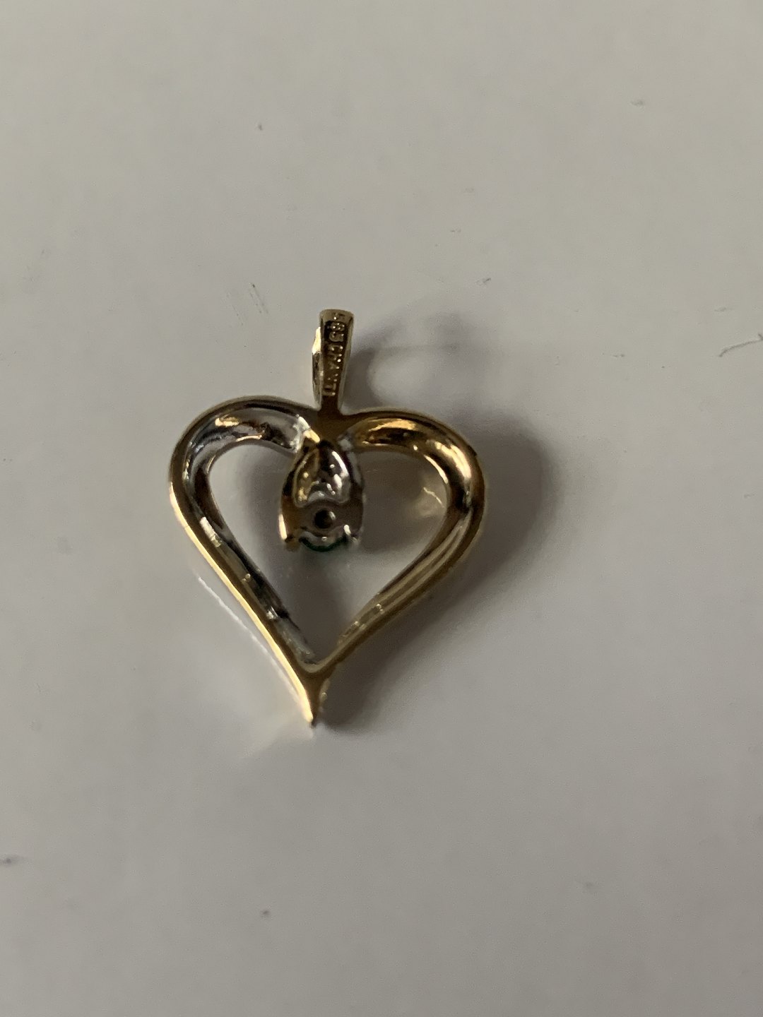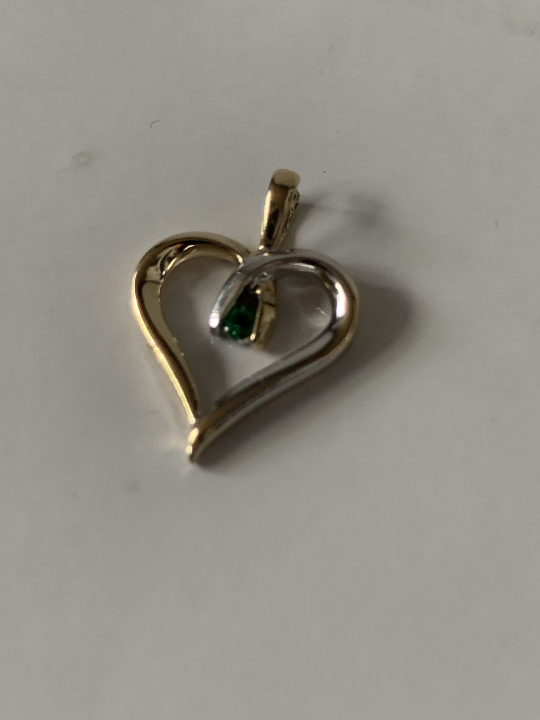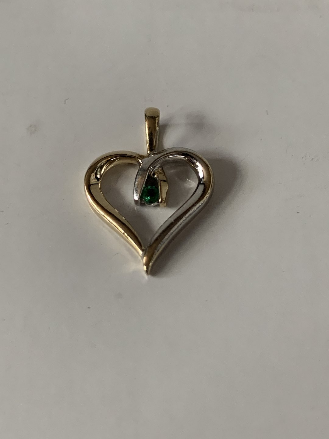 Beautiful heart-shaped pendant in 14 carat red-white gold, with embedded emerald. This pendant will fit perfectly in a thin chain around the neck, and it will be discreet but elegant at the same time. The pendant is designed elegantly and minimalistic, and gives the pendant a nice look. Can be advantageously combined with a gold bracelet.