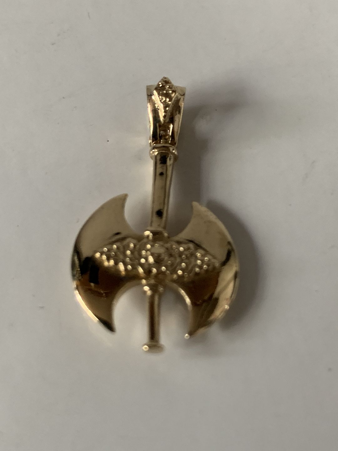 Vedhæng i 14 karat guld, udformet som dobbelt økse- strids økse, og med flotte detaljer og mønstre. Vedhænget udstråler stor energi og styrke. Vedhænget er lavet med mange fine detaljer, der vil komme fuldt til udtryk hvis man kombinerer vedhænget med en massiv guldkæde.