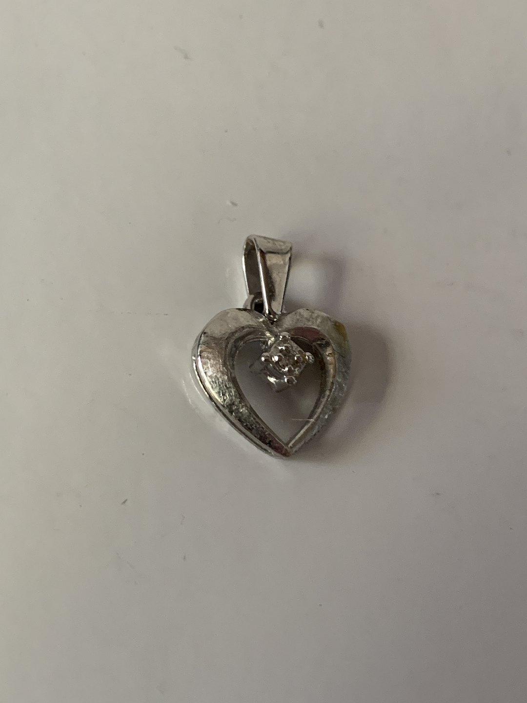 Nice and discreet pendant, shaped like a heart with a diamond in 14 carat white gold. Suitable for a necklace or as a pendant in a bracelet. Beautiful minimalistic and classic jewelry that has been used for many years.