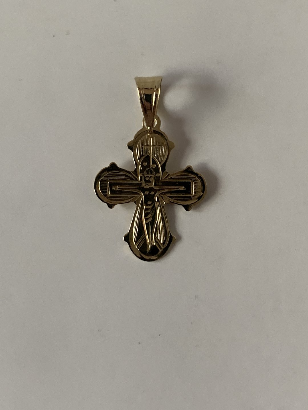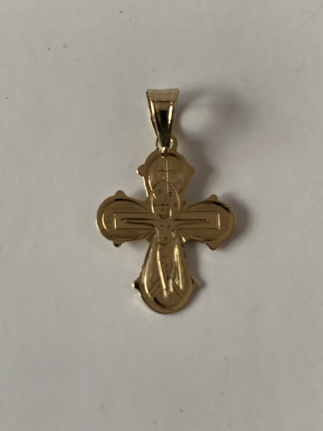 Classic Daymark cross with the suffering Christ on the front, and the Big 5 on the back. The day cross is a traditional piece of jewelry that is often given as a christening or confirmation gift.