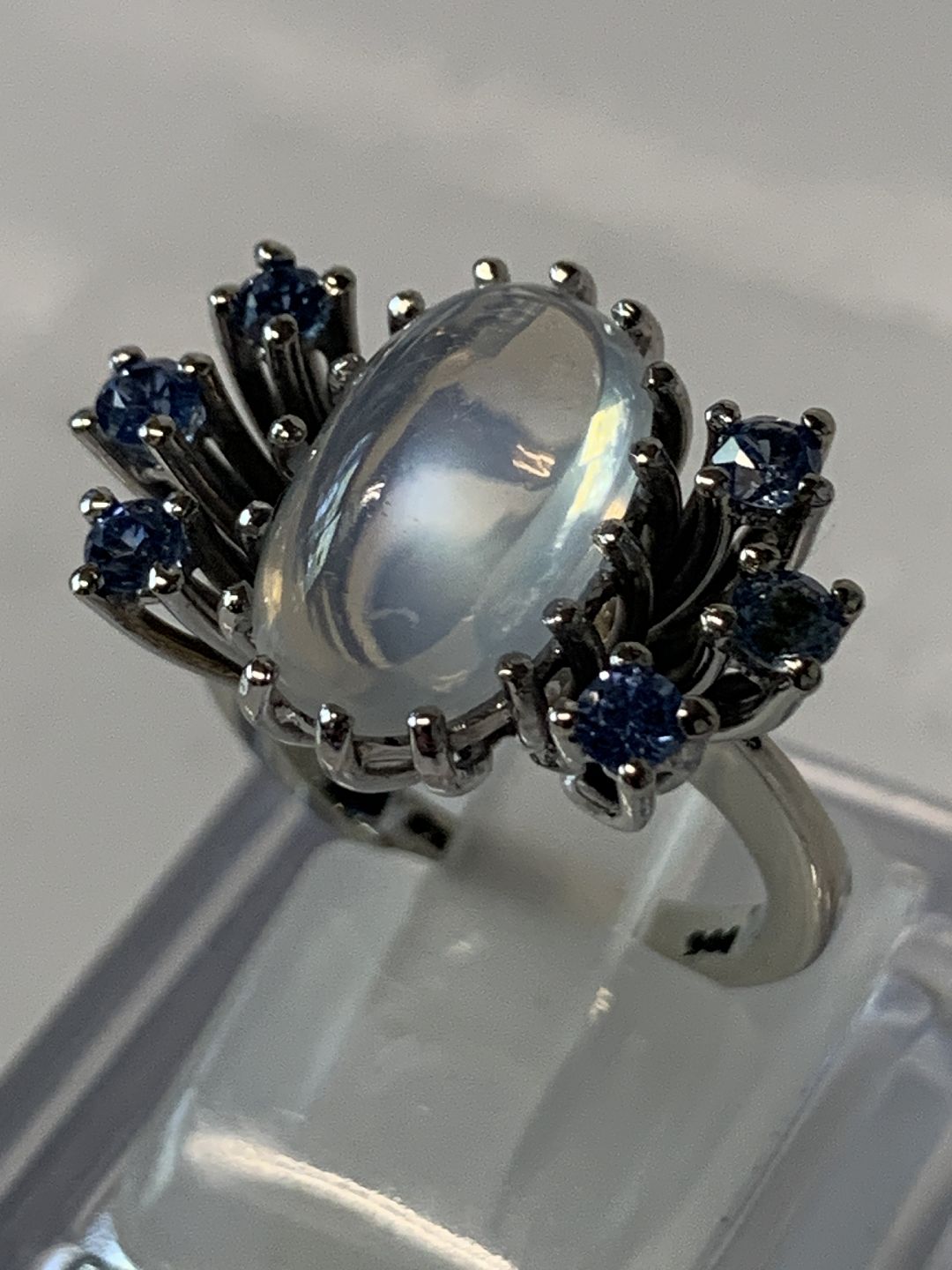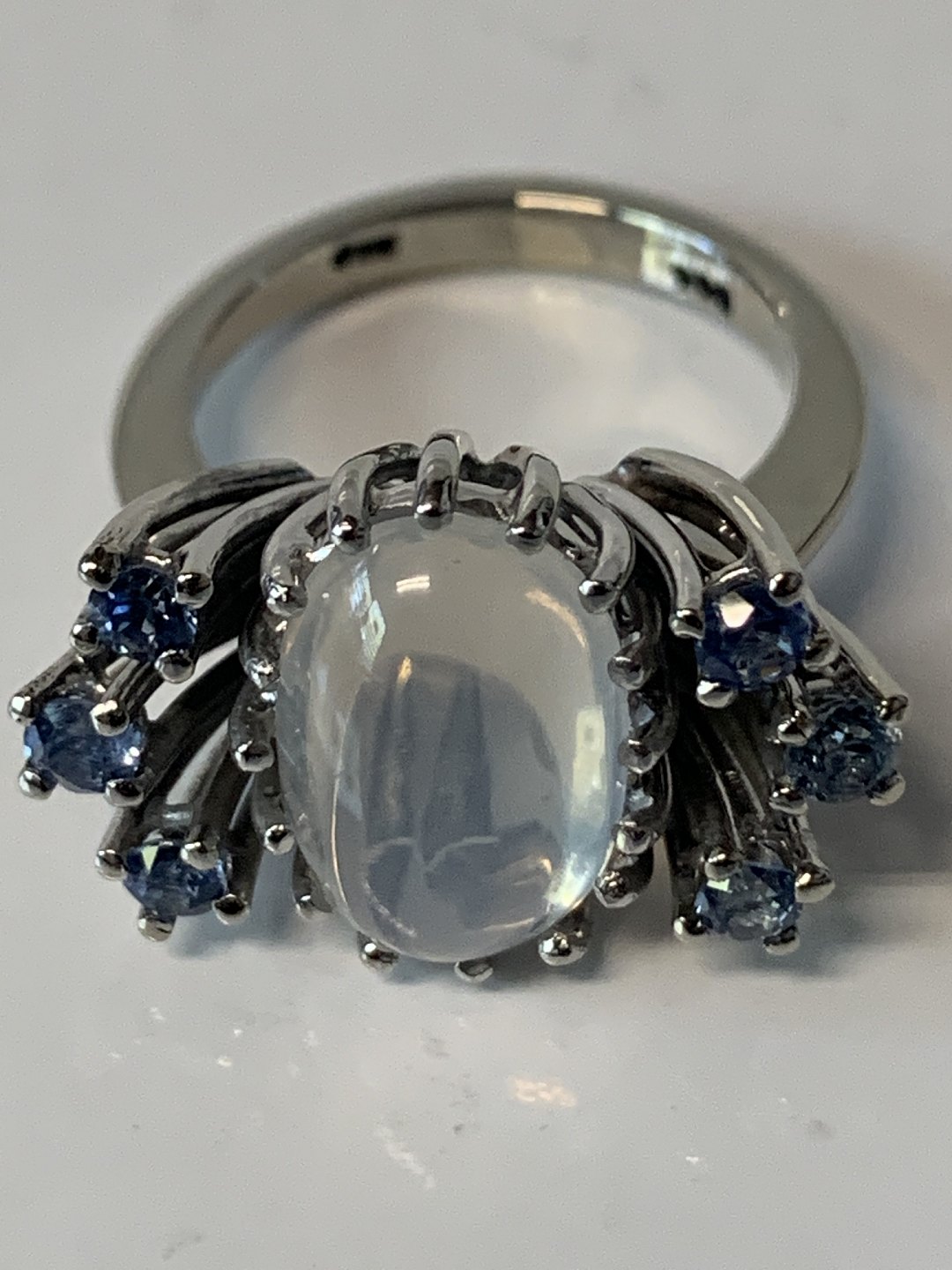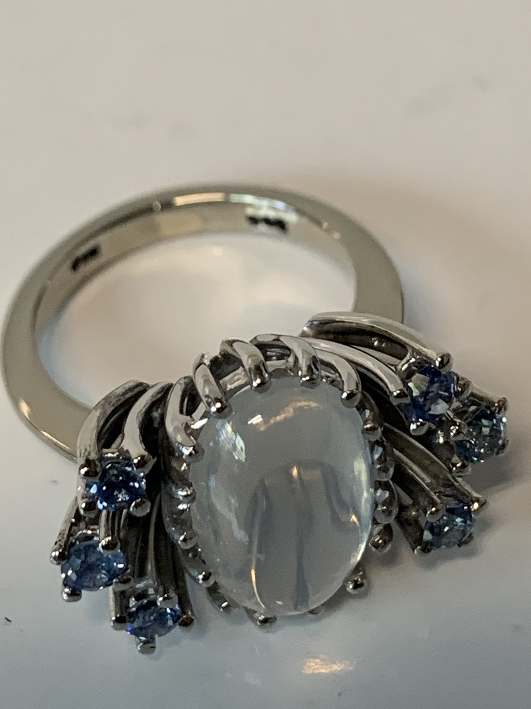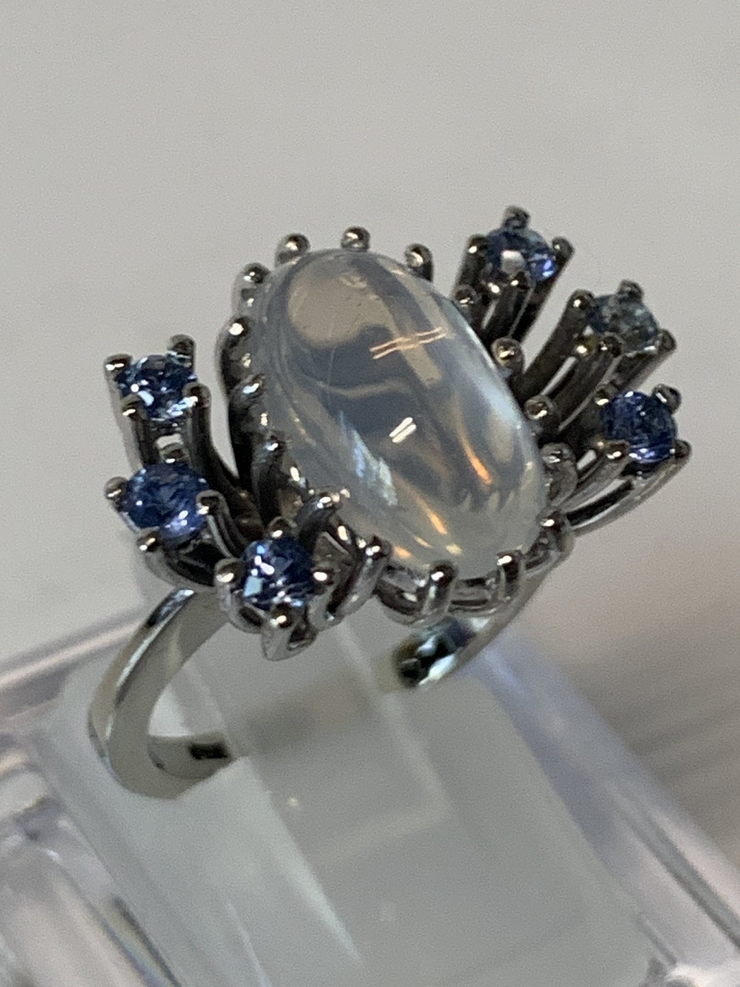 Ladies' ring in 14 carat white gold, with inlaid moonstone and tanzanites,