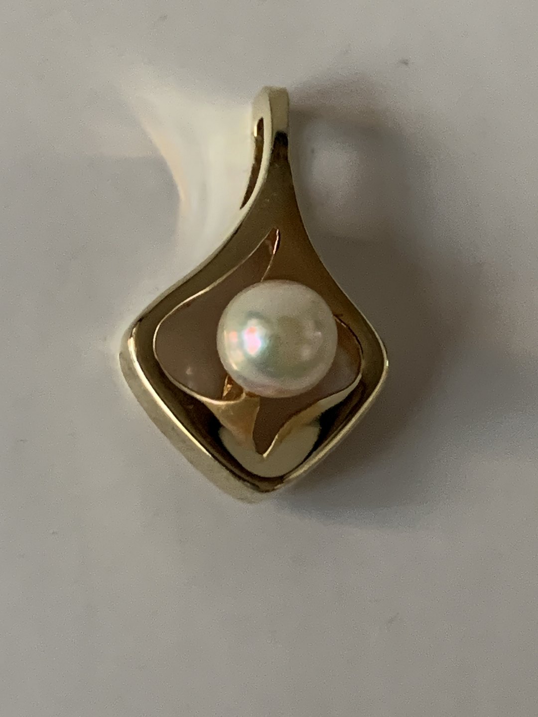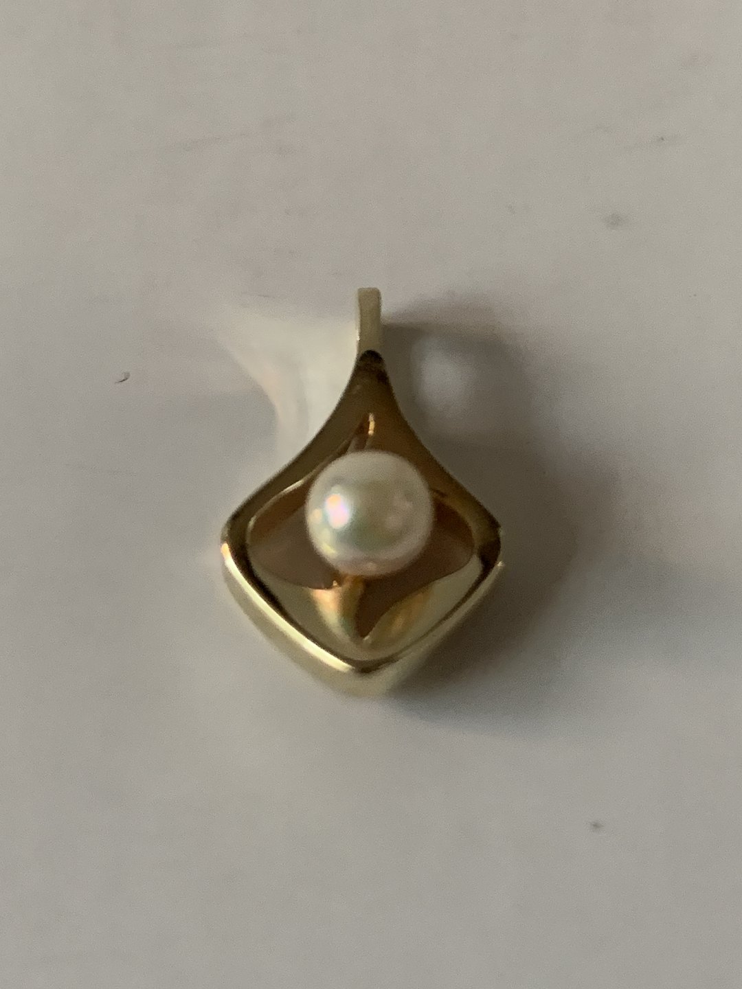 Gold pendant in 14 carat gold, with an inlaid pearl. and will be ideal for a thin gold chain. Here it will be a discreet but elegant necklace for both everyday life and parties. The pendant is shaped beautifully. It is elegant and beautifully executed.