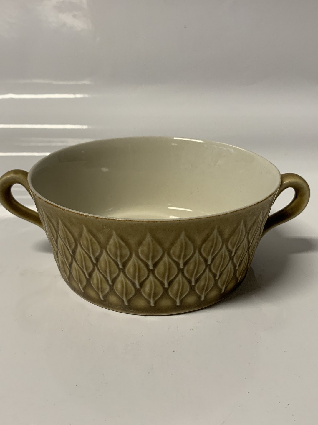 Relief Nissen Kronjyden stentøjsstel Bouillonkop Bladformet mønster Mål 15 cm Højde 5 cm Pæn og velholdt Se i øvrigt vores store udvalg af kaffe-spisestel her: https://www.antikhuset.net/katindex.asp?kukat=553
