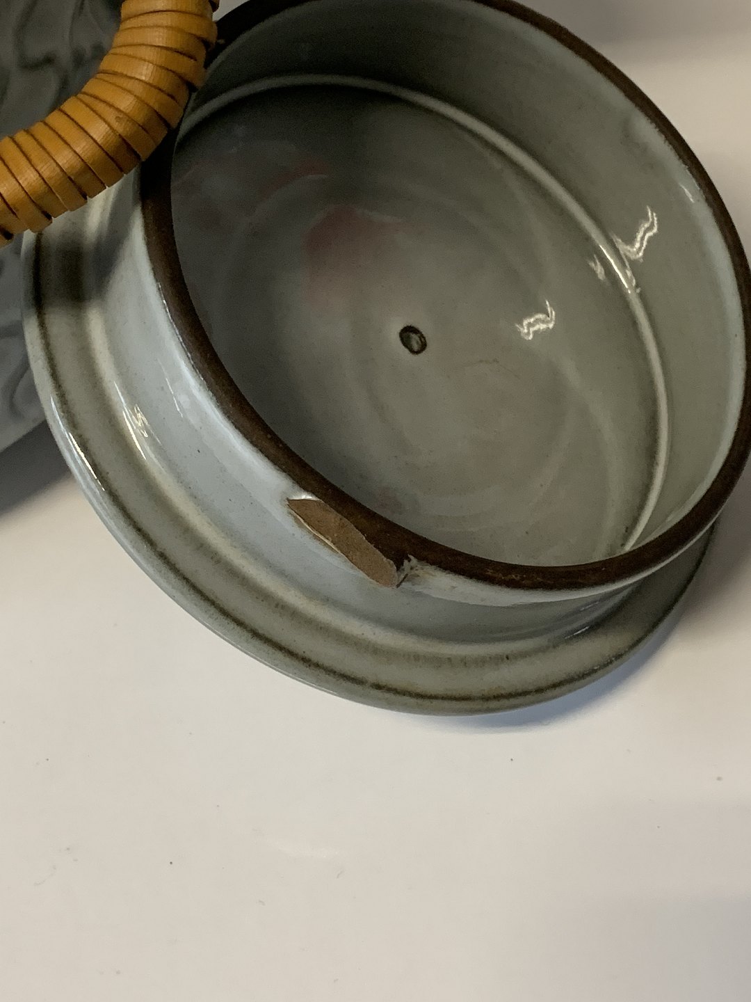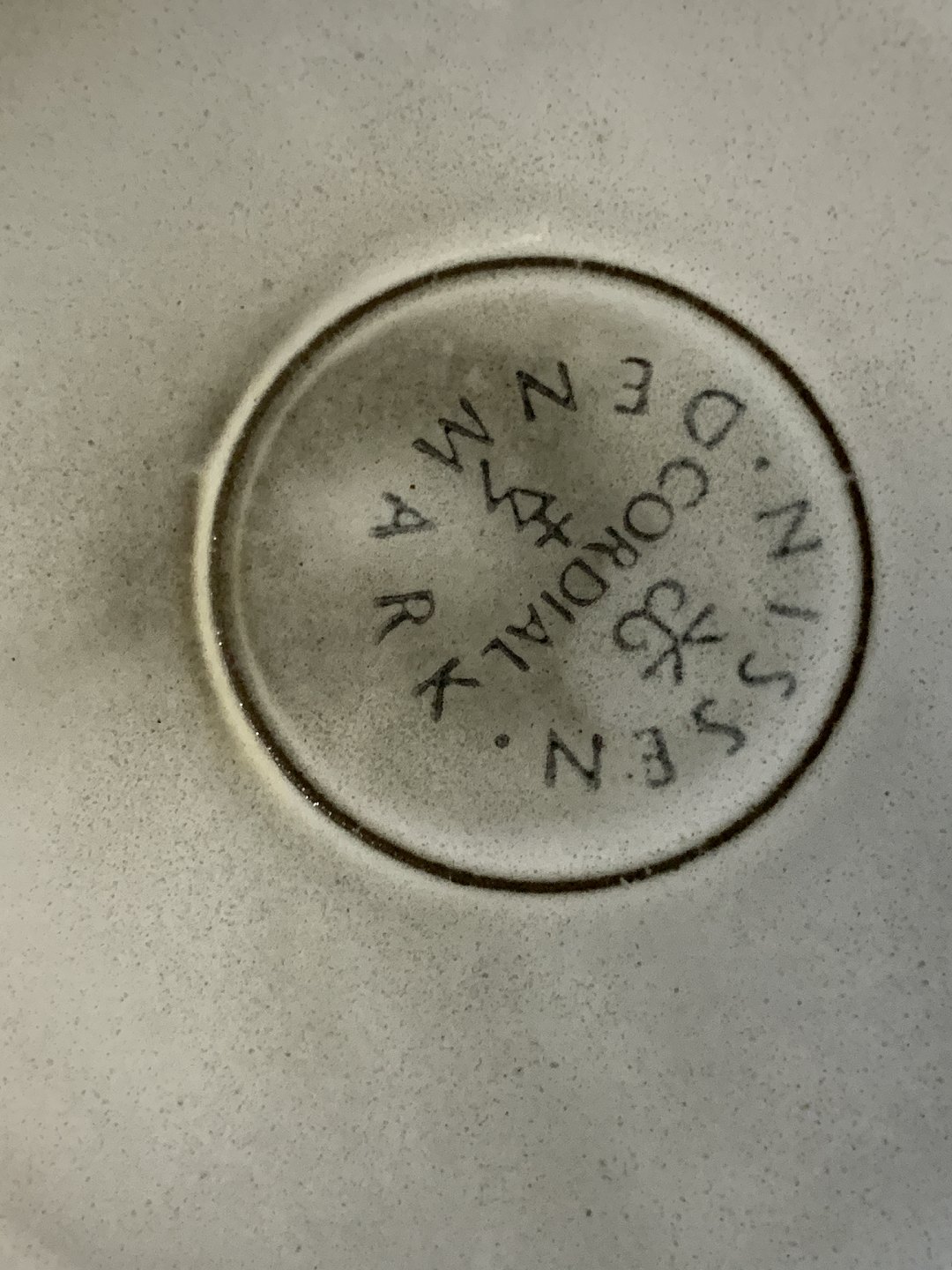 Kronjyden Cordial. Tekande Quistgaard Nissen Diameter 16,5 cm. Højde uden hank 15 cm. Der er et lille skår på låget indvendig se billede 4 Flot og velholdt stand.