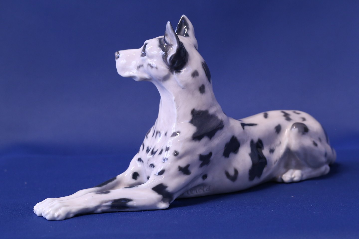 Smuk og livagtig porcelænsfigur fra Royal Copenhagen, der forestiller en liggende dalmatinerhund. Figuren er lavet med utrolig detaljeringsgrad, der kendetegner figurer fra Royal Copenhagen.