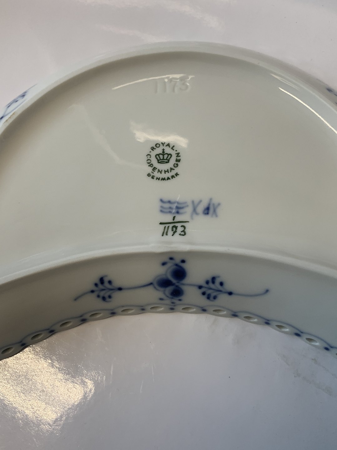 Royal Copenhagen Musselmalet Helblonde, måneformet asiet. Dekorationsnummer 1/1173. Måler 21,5 X 12,5 cm. 2.Sortering. Perfekt stand uden fejl.